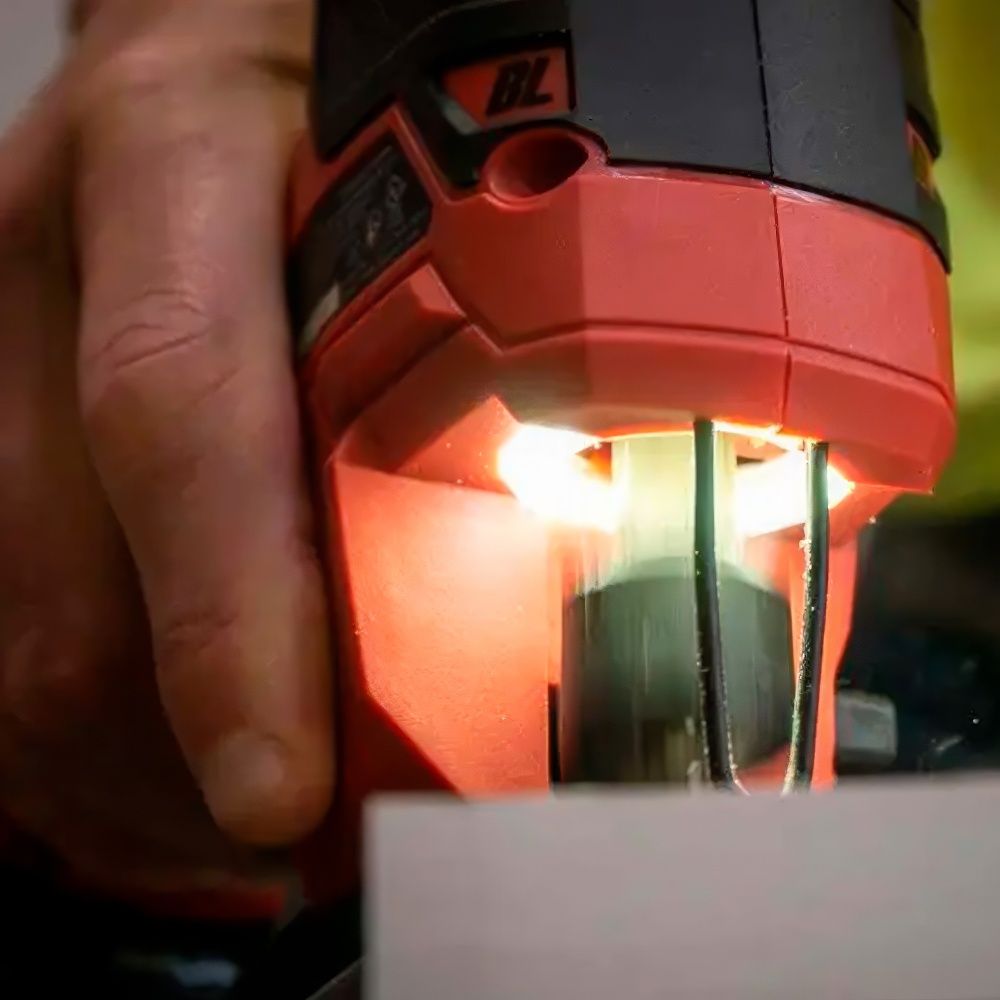 Инструмент развивает до 3000 ходов в минуту и поддерживает 5-ступенчатую настройку скорости с интеллектуальной функцией Auto Speed Sensing — автоматическая регулировка оборотов в зависимости от нагрузки. Для максимального удобства при работе предусмотрена подсветка HALO LIGHT™, которая даёт в 5 раз больше света, чем обычные светодиоды, и встроенный обдув рабочей зоны, обеспечивающий чёткую видимость линии реза.