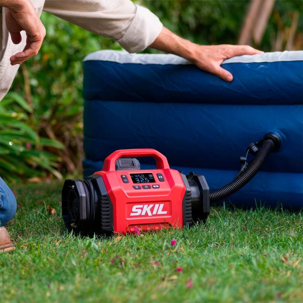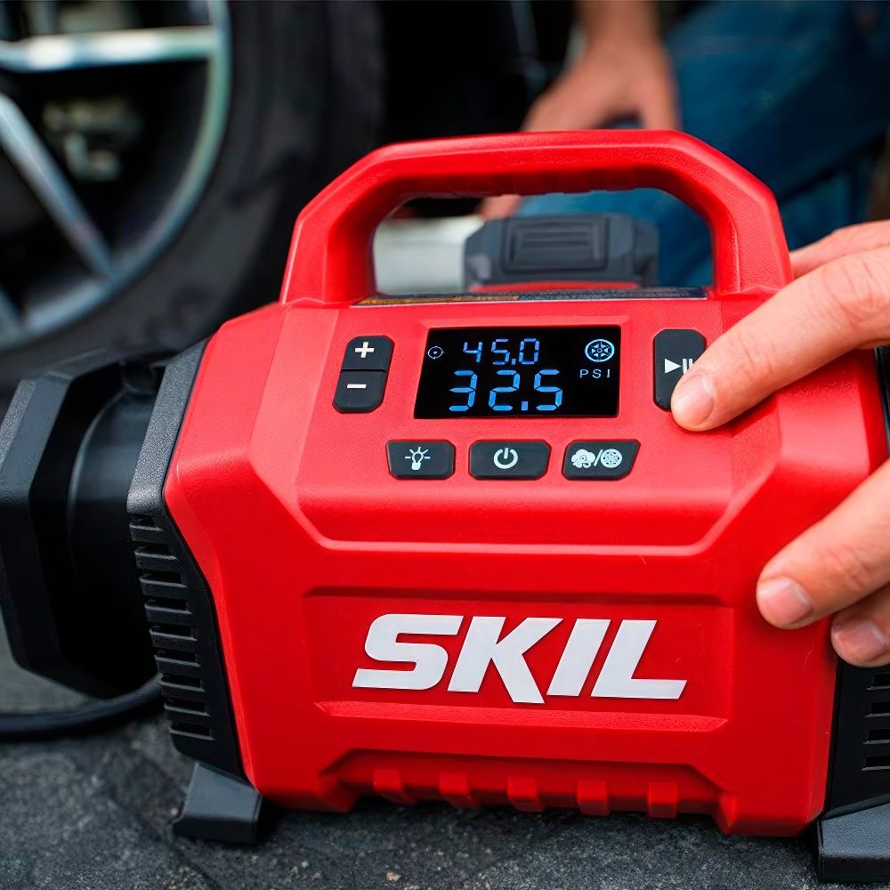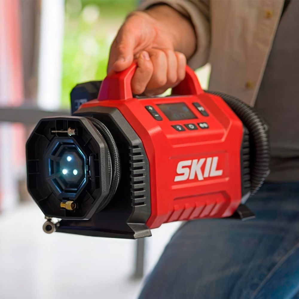 SKIL IF5940 — это компактный и мощный аккумуляторный компрессор, сочетающий в себе два режима работы: высокое давление и большой объём воздуха. Он идеально подходит для накачки автомобильных и велосипедных шин, спортивных мячей, матрасов и других надувных изделий.