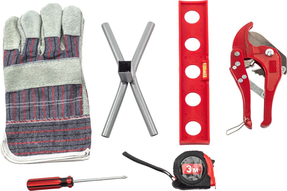 Паспорт изделия, Насадки (диаметр 20,25,32,40,50,63), Подставка под сварочный аппарат, Ключ имбусовый, Кейс, Отвертка, Рулетка, Ножницы для резки труб, Спилковые перчатки, Уровень