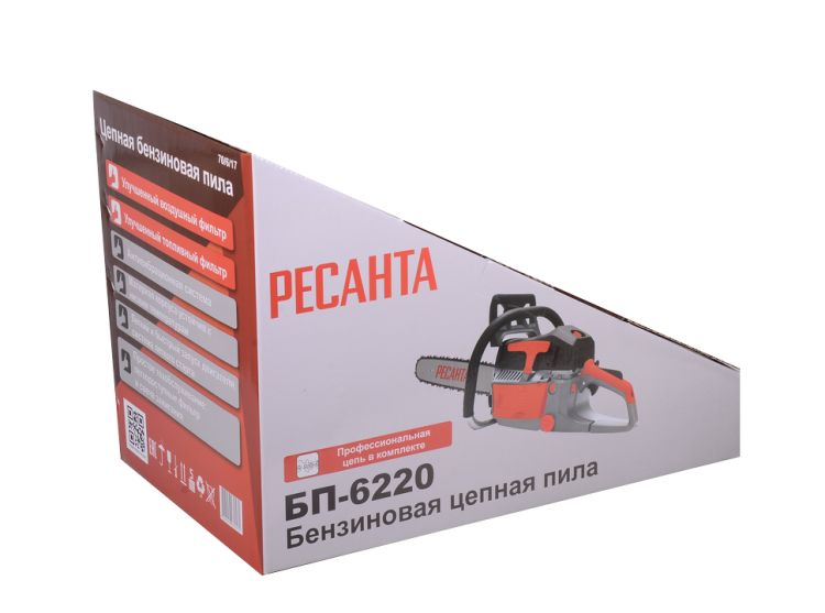Бензопила БП-6220 Ресанта - мощный инструмент для заготовки дров и валки деревьев. Горизонтальное расположение двигателя дает лучшее распределение массы и делает бензопилу компактной. Обладает высокой точностью реза. Безопасности в этой модели уделено много внимания. Блокировки курка газа предотвращает случайное нажатие. Функция механического инерционного тормоза цепи также важна: при резком отскоке пилы во время пиления (вверх и назад) рука упирается в ручку тормоза и отщелкивает ее, а тормозная лента затягивается и тормозит барабан сцепления, цепь при этом останавливается практически мгновенно. Защитный щиток в случае разрыва цепи или ее соскока с шины предотвращает травмирование. Резиновые амортизаторы, расположенные между рукоятками и картером пилы, снижают вредную вибрационную нагрузку при работе с бензопилой, делают работу комфортнее. Масляный бак размещается в передней части картера. Принудительная смазка цепи и шины применяется для снижения трения между ними, что увеличивает срок службы пильной гарнитуры. Легкий старт влияет на скорость запуска, особенно в зимний период. Он добавляет дополнительный крутящий момент при рывке. Преимущества: