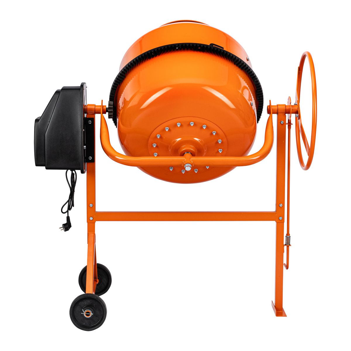 - Удобная загрузка и выгрузка смеси — барабан наклоняется при помощи маховика и легко фиксируется в нужном положении.
