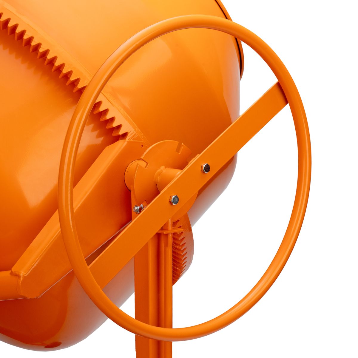 - Прочная конструкция — бетоносмеситель имеет стальную раму и усиленные профили траверсы, втулка оси траверсы наварена на раму отдельным элементом, венец крепится к барабану с помощью внешних проушин, а металлическая опора обеспечивает устойчивость бетономешалки