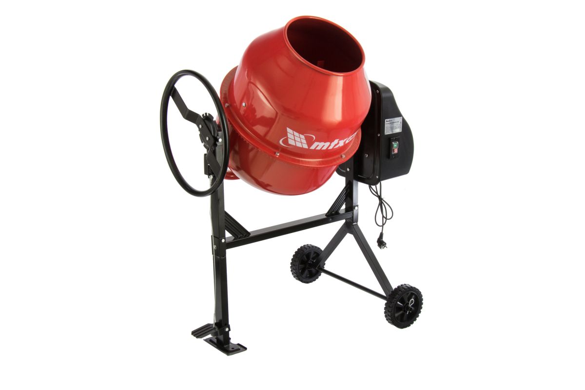 Прочная рама и продуманная конструкция позволяют использовать бетономешалку не только в бытовых условиях, но и на небольших строительных объектах. Вы без труда приготовите бетонную смесь или растворы для заливки стяжек, фундамента, кирпичной кладки. Объем бака составляет 120 л, поэтому за один замес получится до 60 л готового раствора.,Одно из главных достоинств этого бетоносмесителя — дозированная подача смеси. Поворотное колесо вращается вручную, что позволяет пользователю самому определять объем выливаемого раствора.