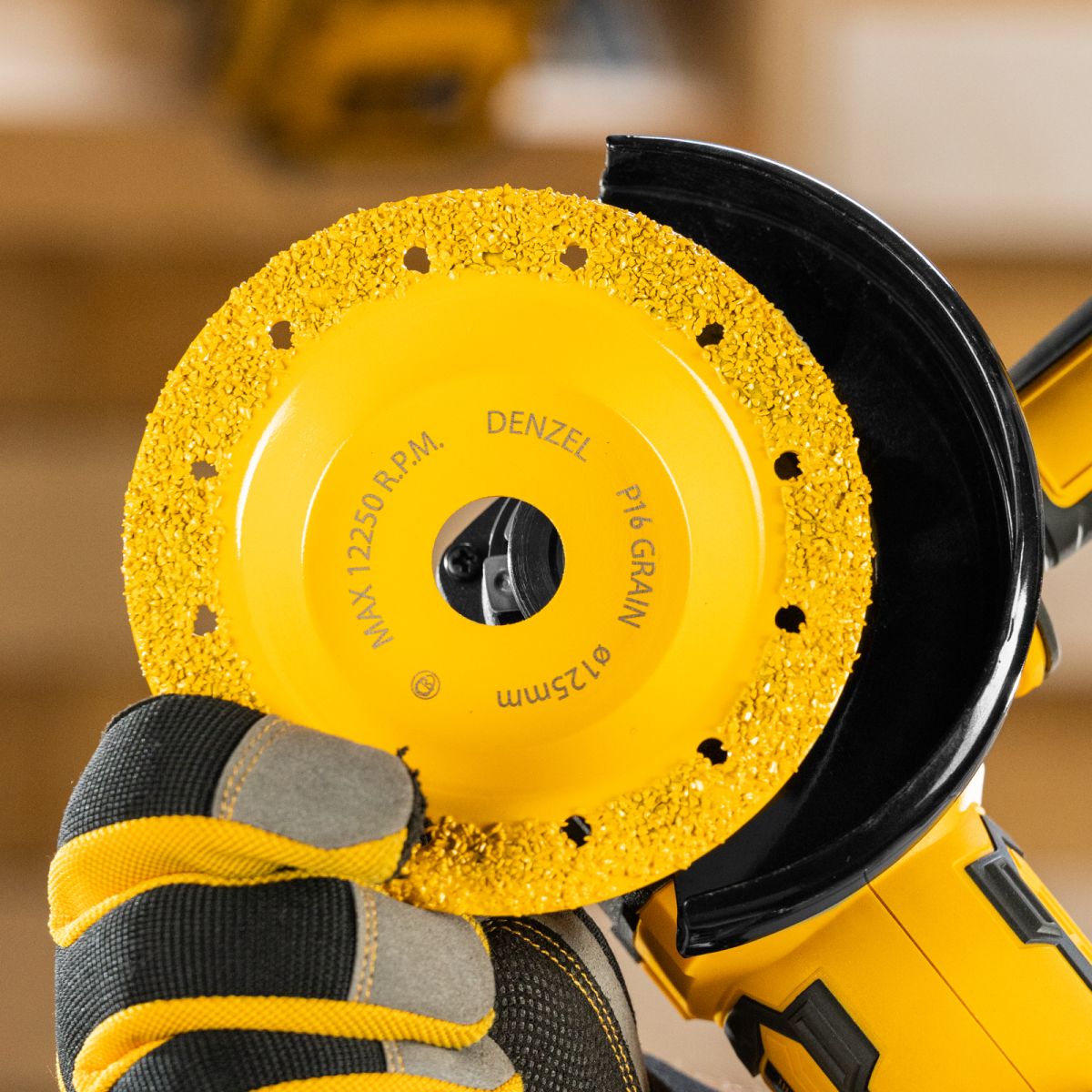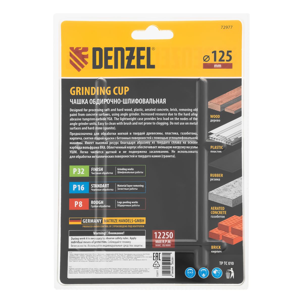 Твердосплавная зачистная чашка Denzel 72977 диаметром 125 мм, со средним зерном P16 и наклонной рабочей частью, устанавливается на углошлифовальную машину (УШМ) и используется для черновой обработки деревянных, пластиковых, резиновых, газобетонных и кирпичных поверхностей. Позволяет устранить неровности, снять слой старой краски, клея, цемента. В ходе зачистных работ не образуется абразивная пыль, что снижает вредное воздействие на здоровье пользователя. Наклонная рабочая часть упрощает обработку деталей сложной формы. Облегченный корпус позволяет избежать излишней нагрузки на УШМ и преждевременного выхода инструмента из строя.