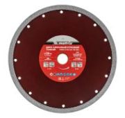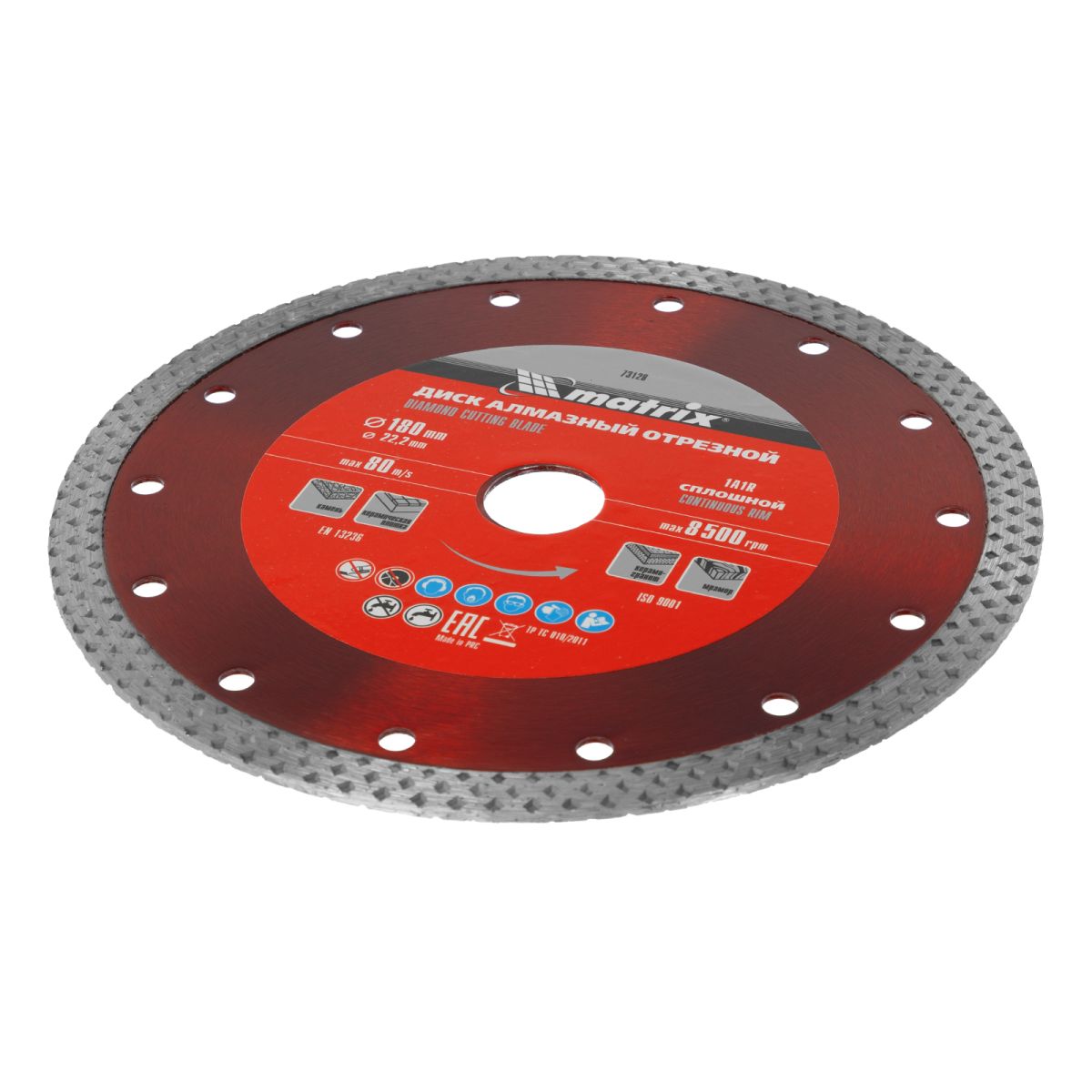 Сплошной отрезной алмазный диск Matrix 73128 диаметром 180 мм — оснастка для болгарок и плиткорезов с диаметром вала 22,2 мм. Применяется для сухого и мокрого резания мрамора, искусственного и натурального камня, керамогранитной и керамической плитки. Использование без подачи воды расширяет возможности инструмента, но для увеличения ресурса диска рекомендуется применять водяное охлаждение. Оснастка предназначена для решения бытовых задач.