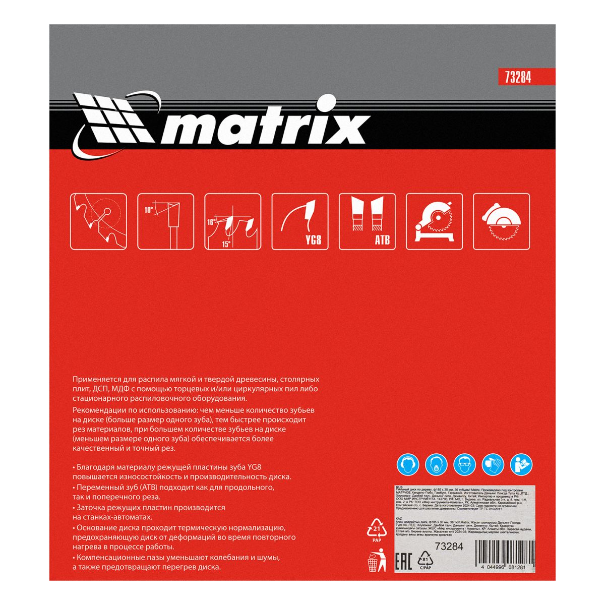 Пильный диск по дереву Matrix 73284 диаметром 185 х 30 мм, с 36 зубьями, — оснастка для циркулярных и торцовочных пил с соответствующим посадочным и внешним диаметром. Используется для продольного/поперечного реза материалов из мягкой и твердой древесины, ДСП, ДВП, фанеры, столярных плит. Диск подходит для бытового и профессионального применения.