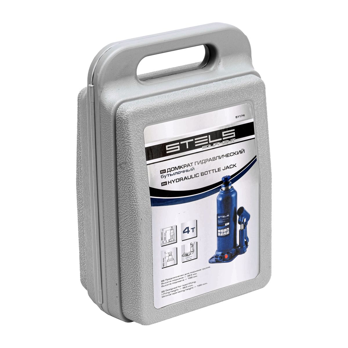 Гидравлический бутылочный домкрат Stels 51174 в пластиковом кейсе предназначен для поднятия грузов весом до 4 т на высоту 188-363 мм. Он не занимает много места и легко помещается в багажник, поэтому его можно брать с собой в дорогу или хранить в гараже. Используется для самостоятельного ремонта авто, также подходит для профессионального применения на станциях технического обслуживания.