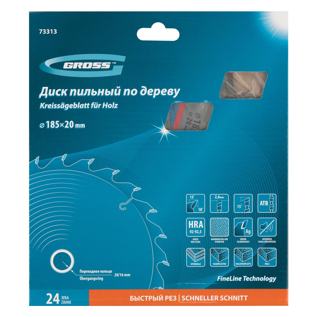 Пильный диск Gross 73313, ф185 х 20 мм, с 24 зубьями и переходным кольцом 20/16 мм, предназначен для распила древесины мягких и твердых пород, ДСП, МДФ и фанеры. Является оснасткой для циркулярных и торцовочных пил с посадочным диаметром 20 мм, благодаря универсальному типу зубьев АТВ подходит как для продольного, так и для поперечного реза материалов. Диск изготовлен на высококачественном оборудовании, специально рассчитан на профессиональное применение и выполнение большого объема работ.