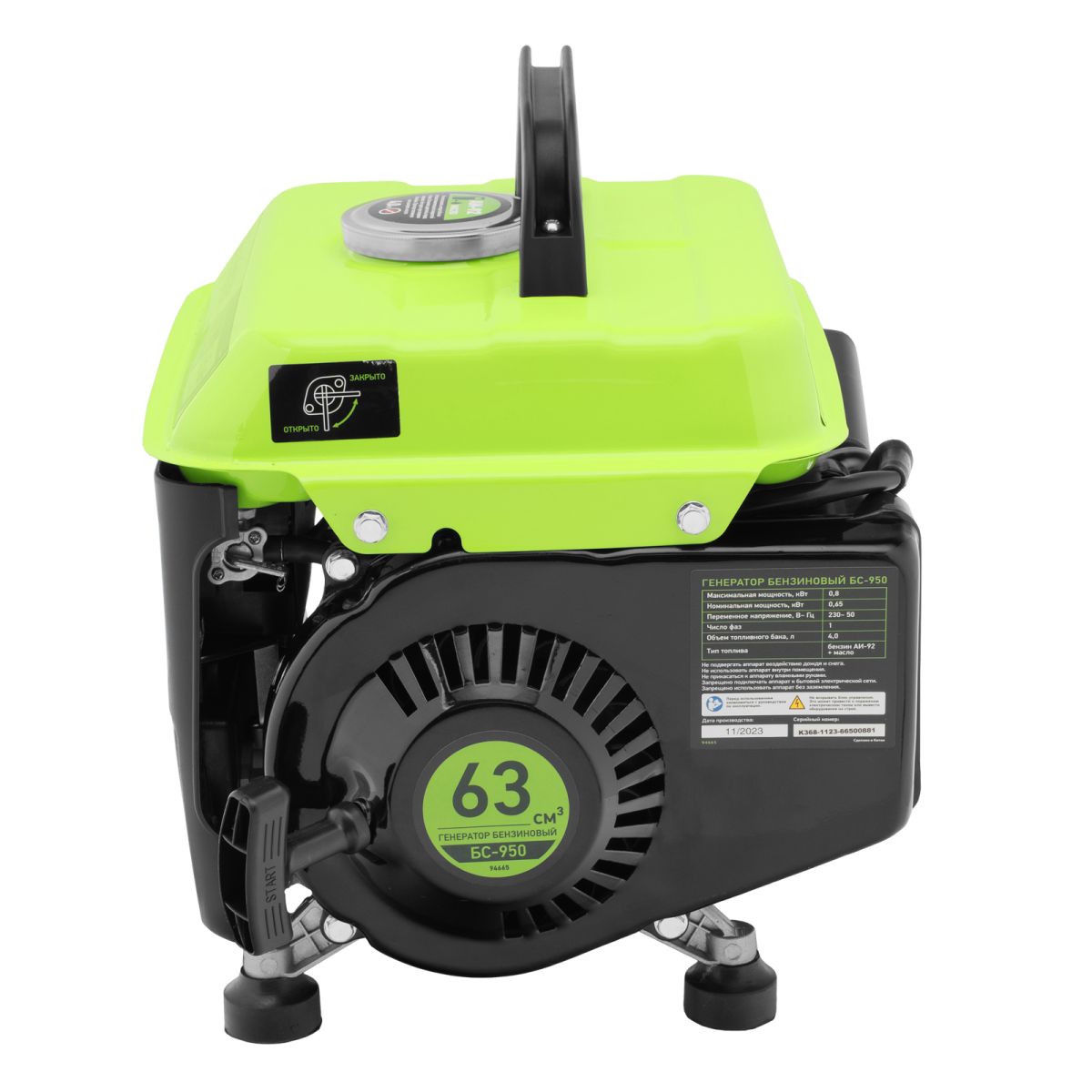 Бензиновый генератор Сибртех БС-950 94665 на 230 В, мощностью 0,8 кВТ, с 2-тактным двигателем и ручным стартером, с баком объемом 4 л, отличается небольшими габаритами, что делает его незаменимым на природе, на рыбалке, на даче или в гараже. Мощности 0,8 кВт достаточно для подключения электроинструмента или приборов с небольшим уровнем потребления энергии. На одной заправке генератор способен проработать до 4 часов.