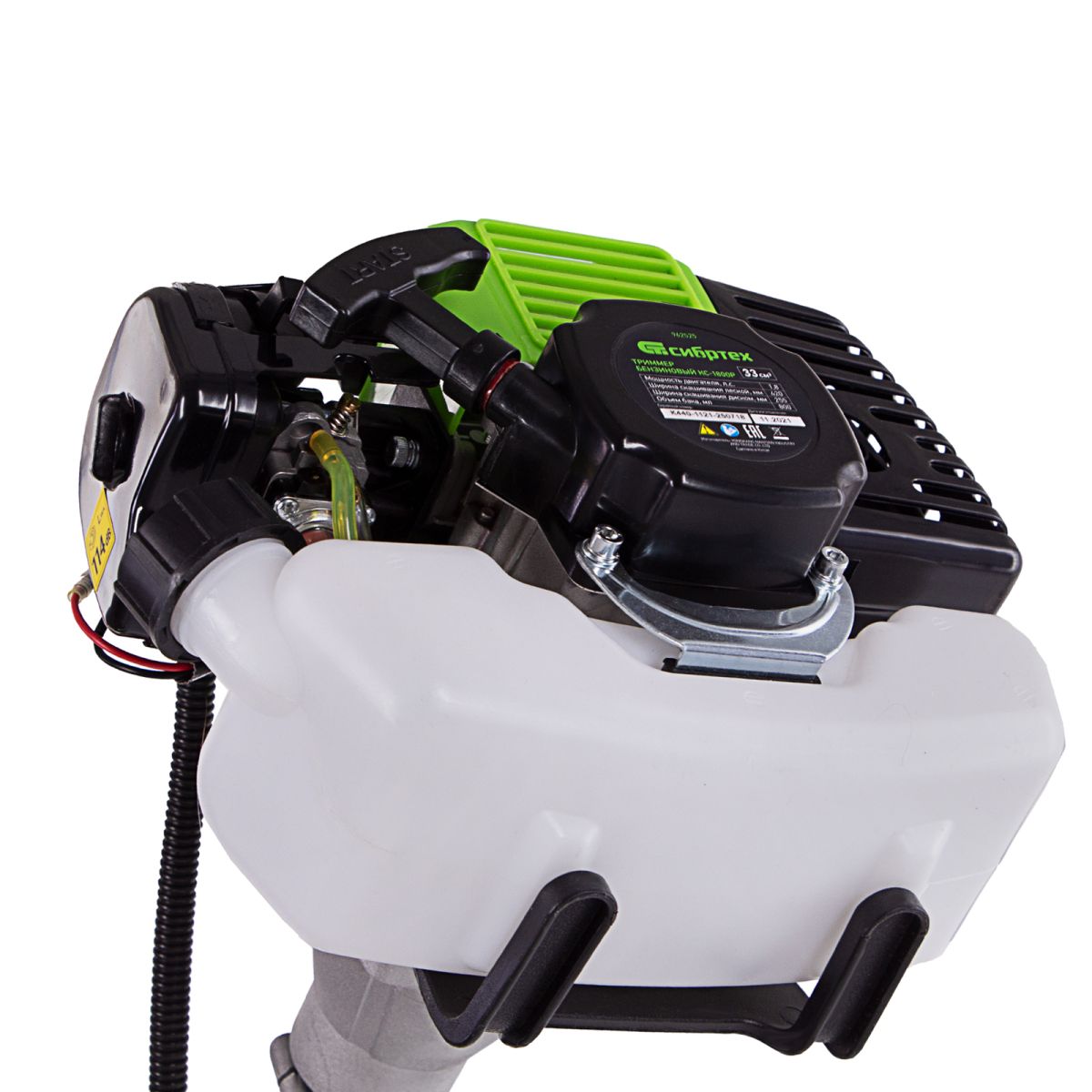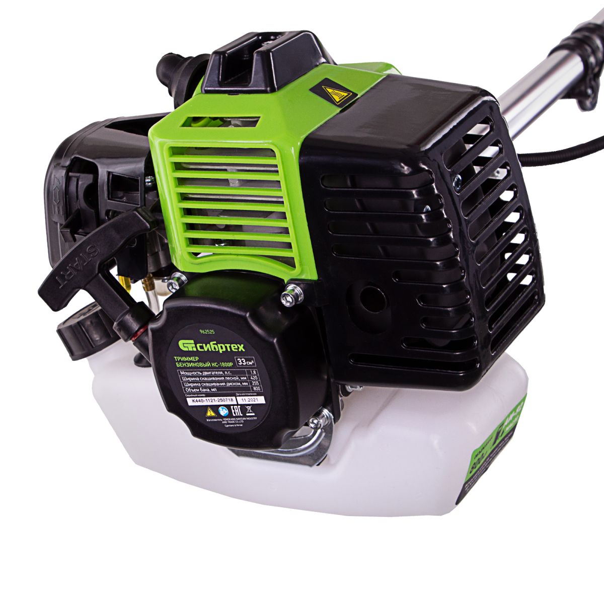 Бензиновый триммер Сибртех КС-1800Р 962525 с разъемной штангой, поставляющийся комплектом из 2 частей, имеет двигатель объемом 33 куб. см и мощностью 1,8 л. с., благодаря чему успешно справляется с подравниванием газона, скашиванием травы на лужайке и уничтожением сорняков. Выполнение этих задач облегчают режущие элементы — катушка с леской и трехлопастный нож. Леской триммер скашивает 42 см за один проход, а ножом — 25,5 см, поэтому можно за короткое время привести дачный участок в порядок. Благодаря разборной штанге мотокоса не занимает много места во время хранения и транспортировки.