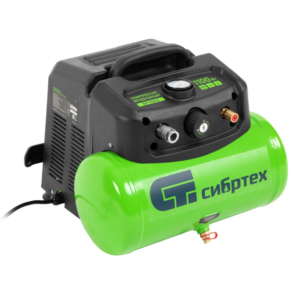 Воздушный безмасляный компрессор Сибртех BL 1100/6 58059 мощностью 1100 Вт, с ресивером емкостью 6 литров, служит для подачи сжатого воздуха под давлением до 8 бар со скоростью 180 л/мин. К нему можно подключить краскораспылитель, продувочный пистолет, заклепочник, пистолет для накачки шин и другой пневмоинструмент. Отсутствие масла делает компрессор оптимальным для выполнения покрасочных работ и продувки электронных компонентов. Устройство предназначено для бытового использования.,Одна из основных особенностей данной модели — компактность и удобство в перевозке. Компрессор отличается небольшим весом и дополнен эргономичной транспортировочной ручкой.