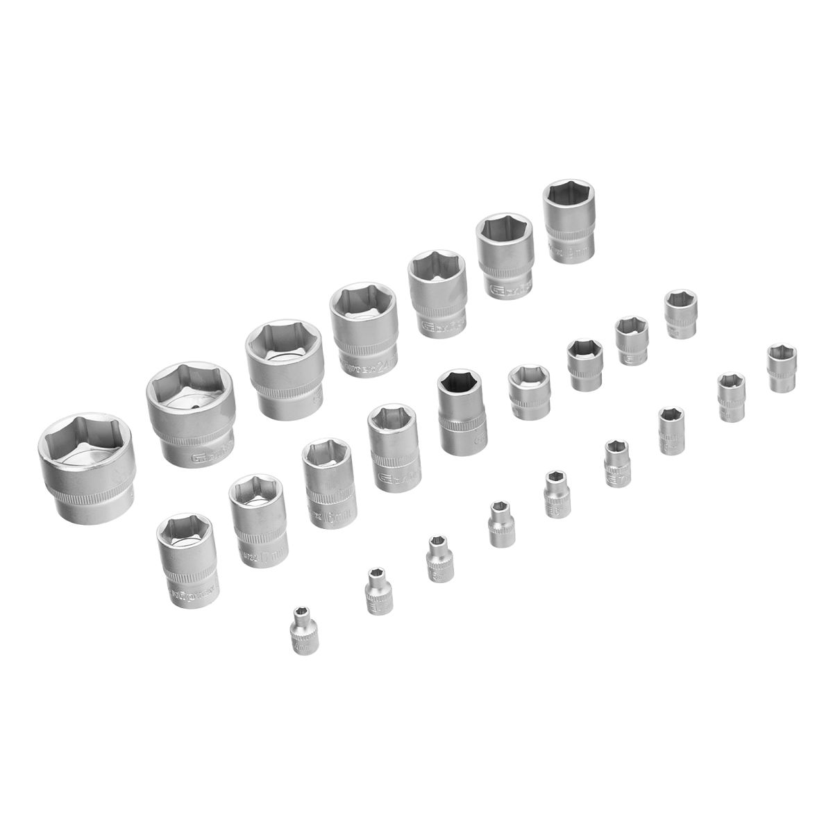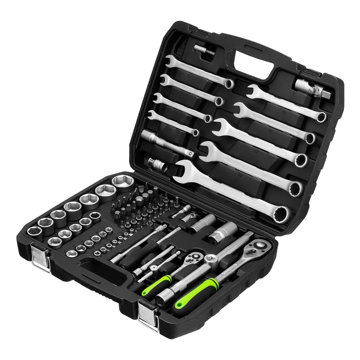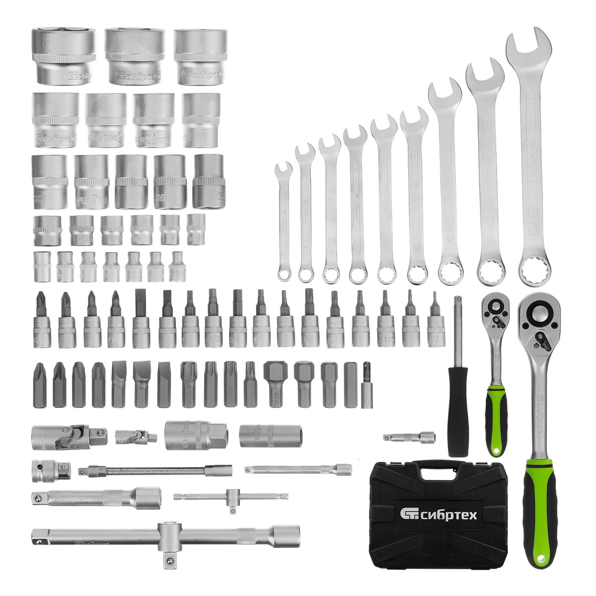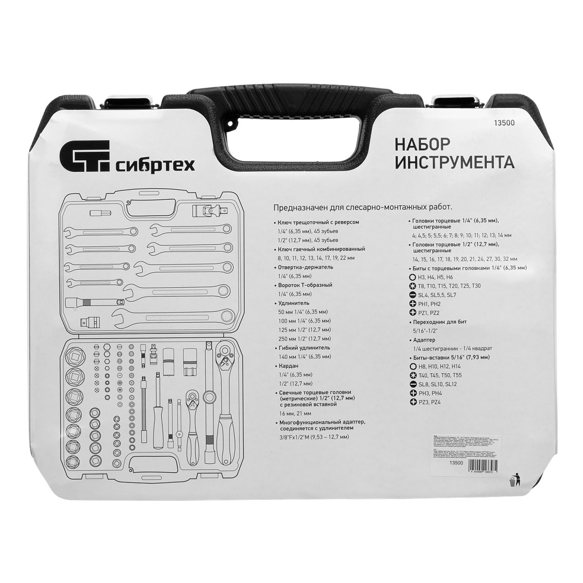 Набор инструмента Сибртех 13500, состоящий из 83 предметов с присоединительными размерами 1/2" и 1/4", предназначен для ремонта и обслуживания автомобилей, также пригодится в быту. Имеющиеся в комплекте насадки рассчитаны на крепеж с различными типами профилей и шлицев, включая HEX и TORX. Набор будет полезен профессиональным мастерам и автолюбителям.