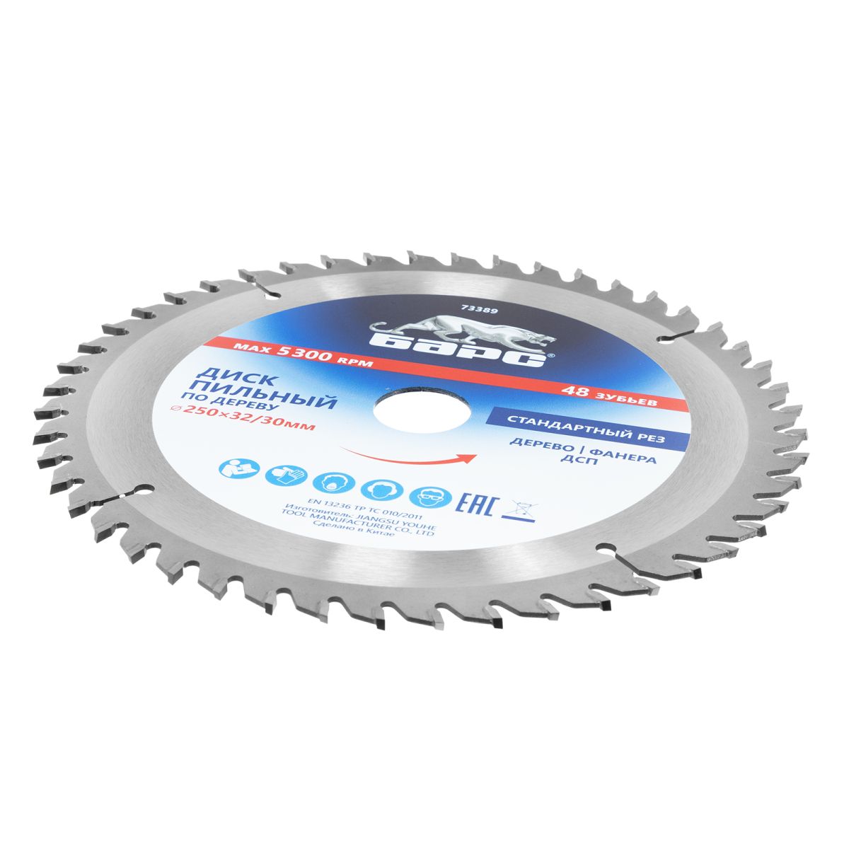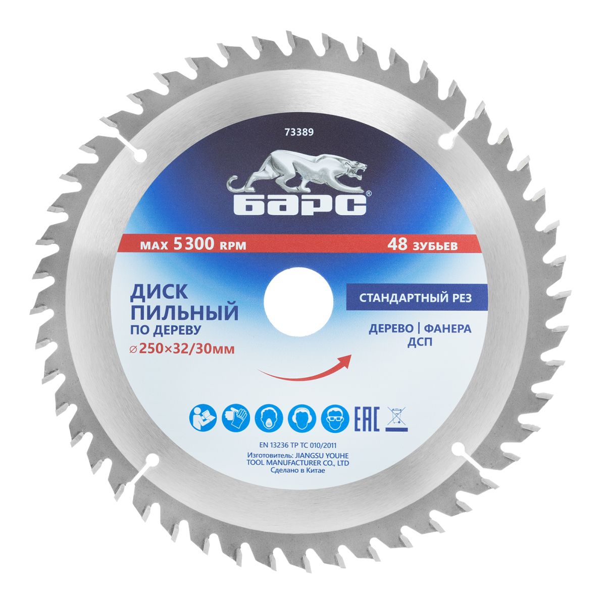 Пильный диск Барс 73389 диаметром 250 х 32 мм, с 48 зубьями и кольцом 32/30 мм, предназначен для оптимального по скорости и качеству пиления древесины мягких и твердых пород, ДСП, МДФ и фанеры. Мелкие зубья типа АТВ и оптимально подобранный угол зуба позволяют производить качественный поперечный распил. Диск используется совместно с торцовочными и циркулярными пилами с посадкой 32 мм. В комплект входит переходное кольцо на диаметр 30 мм, расширяющее возможности применения оснастки. Диск подходит для интенсивной эксплуатации и может использоваться в профессиональной сфере.