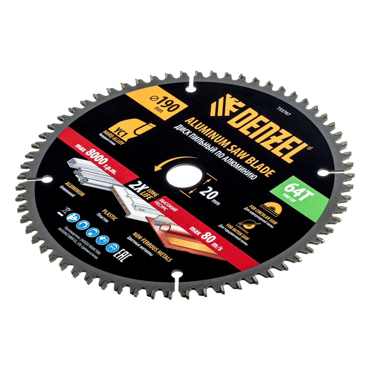 Пильный диск Denzel 733767 диаметром 190 x 20 мм, с 64 зубьями, предназначен для точного распиливания заготовок из алюминия, пластика, цветных металлов. Устанавливается на циркулярную или торцовочную пилу, также возможно использование с распиловочным станком. Зубья трапециевидно-плоского типа (TCG) с отрицательным углом заточки обеспечивают ровный рез без сколов. В комплект поставки входит переходное кольцо 20/16 мм, позволяющее изменить посадочный диаметр при необходимости.
