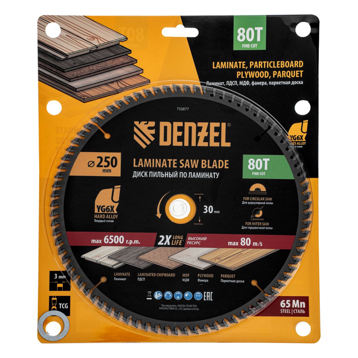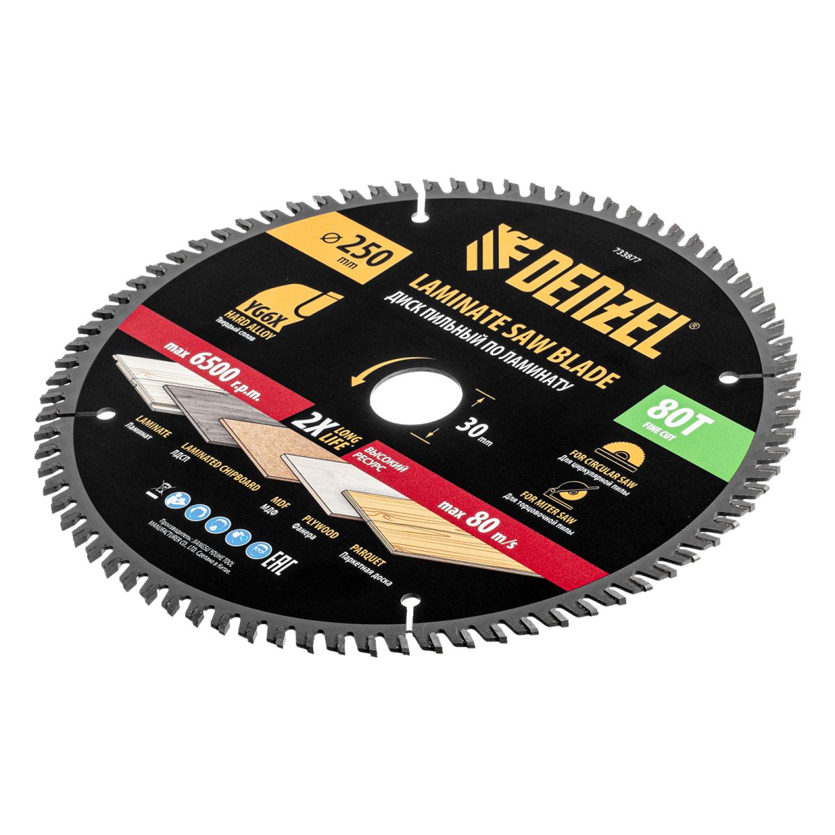 Пильный диск Denzel 733877 диаметром 250 x 30 мм, с 80 зубьями, используется для точного распиливания ламината, ЛДСП, МДФ, фанеры, паркетной доски. 80 мелких трапециевидно-плоских зубьев с положительным углом заточки позволяют эффективно решать поставленные задачи, обеспечивая максимально чистый рез. Диск устанавливается на циркулярную или торцовочную пилу, а также на распиловочный станок. Можно установить оснастку на инструмент с другим посадочным диаметром — для этого предусмотрено переходное кольцо 30/20 мм.