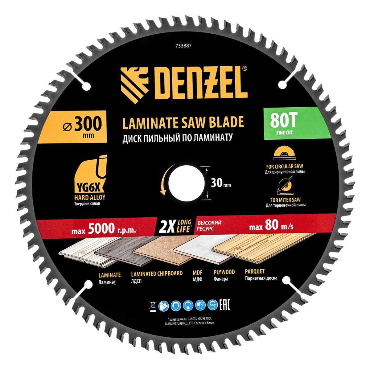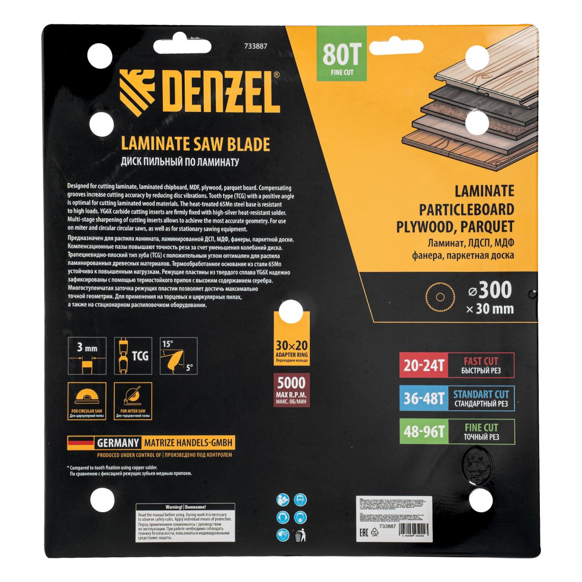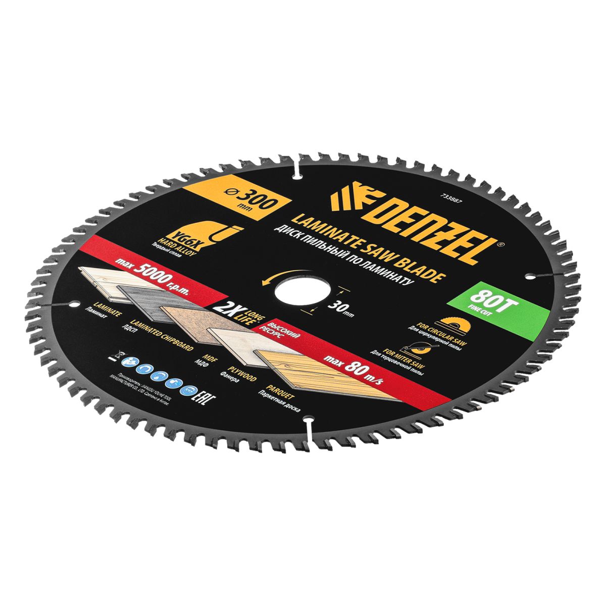 Пильный диск Denzel 733887 диаметром 300 x 30 мм, с 80 зубьями, используется для точного распиливания ламината, ЛДСП, МДФ, фанеры, паркетной доски. 80 мелких трапециевидно-плоских зубьев с положительным углом заточки позволяют эффективно решать поставленные задачи, обеспечивая максимально чистый рез. Диск устанавливается на циркулярную или торцовочную пилу, а также на распиловочный станок. Можно установить оснастку на инструмент с другим посадочным диаметром — для этого предусмотрено переходное кольцо 30/20 мм.