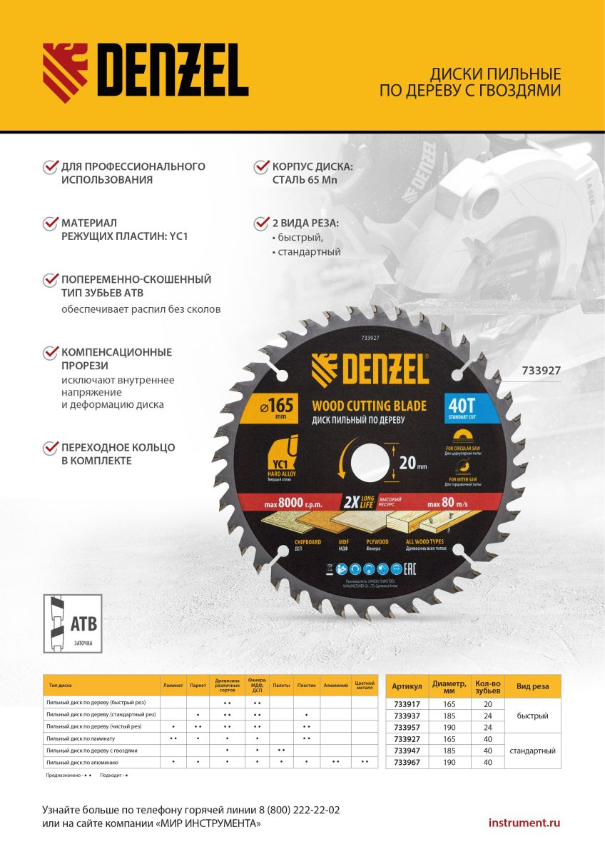 Пильный диск Denzel 733967 диаметром 190 x 30 мм, с 40 зубьями типа ATB, предназначен для продольного и поперечного распиливания древесины всех типов, в том числе с гвоздями и остатками бетона, а также ДСП, МДФ, фанеры. Тип реза — стандартный. Режущие пластины из твердого сплава YC1, прошедшие многоступенчатую заточку, позволяют успешно справляться с прочными материалами. Диск устанавливается на циркулярную, торцовочную пилу или на распиловочный станок. В комплект поставки входит переходное кольцо 30/20 мм, позволяющее изменить посадочный диаметр при необходимости.