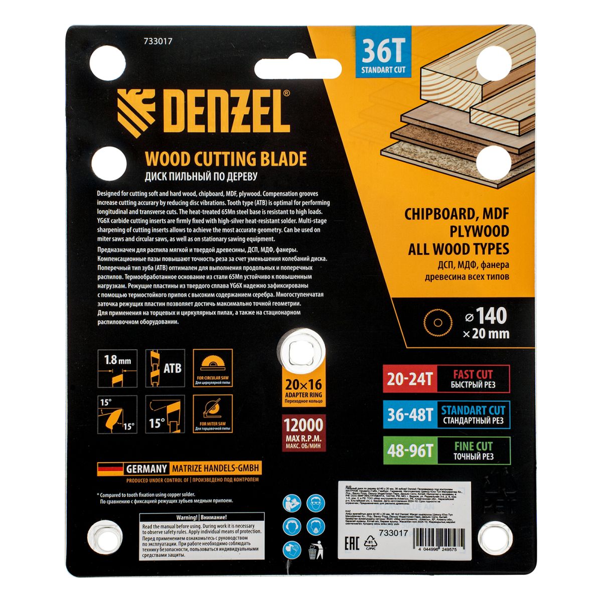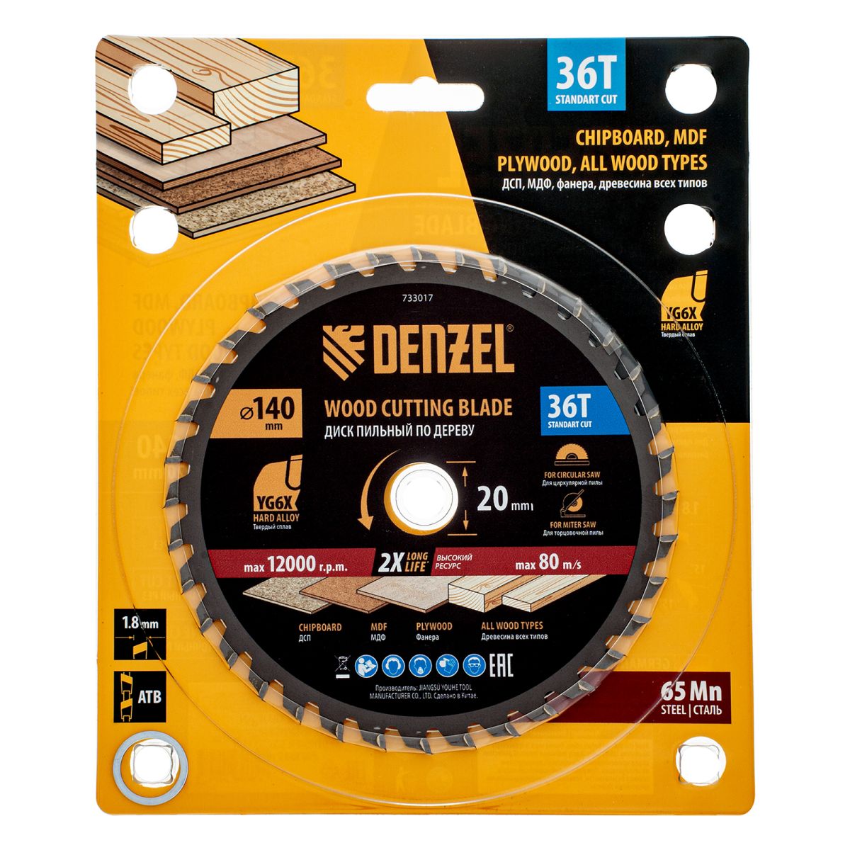 Пильный диск Denzel 733017 диаметром 140 x 20 мм, с 36 зубьями, предназначен для продольного и поперечного распила твердой и мягкой древесины, фанеры, МДФ, ДСП. 36 зубьев типа ATB с режущими пластинами оптимальной геометрии обеспечивают качественный рез. Тип реза — стандартный. Режущие пластины из твердого сплава YG6X сохраняют рабочие свойства при интенсивном использовании. Диск устанавливается на циркулярную, торцовочную пилу или на распиловочный станок. В комплект поставки входит переходное кольцо с 20 на 16 мм, что позволяет изменить посадочный размер и расширяет возможности использования диска.