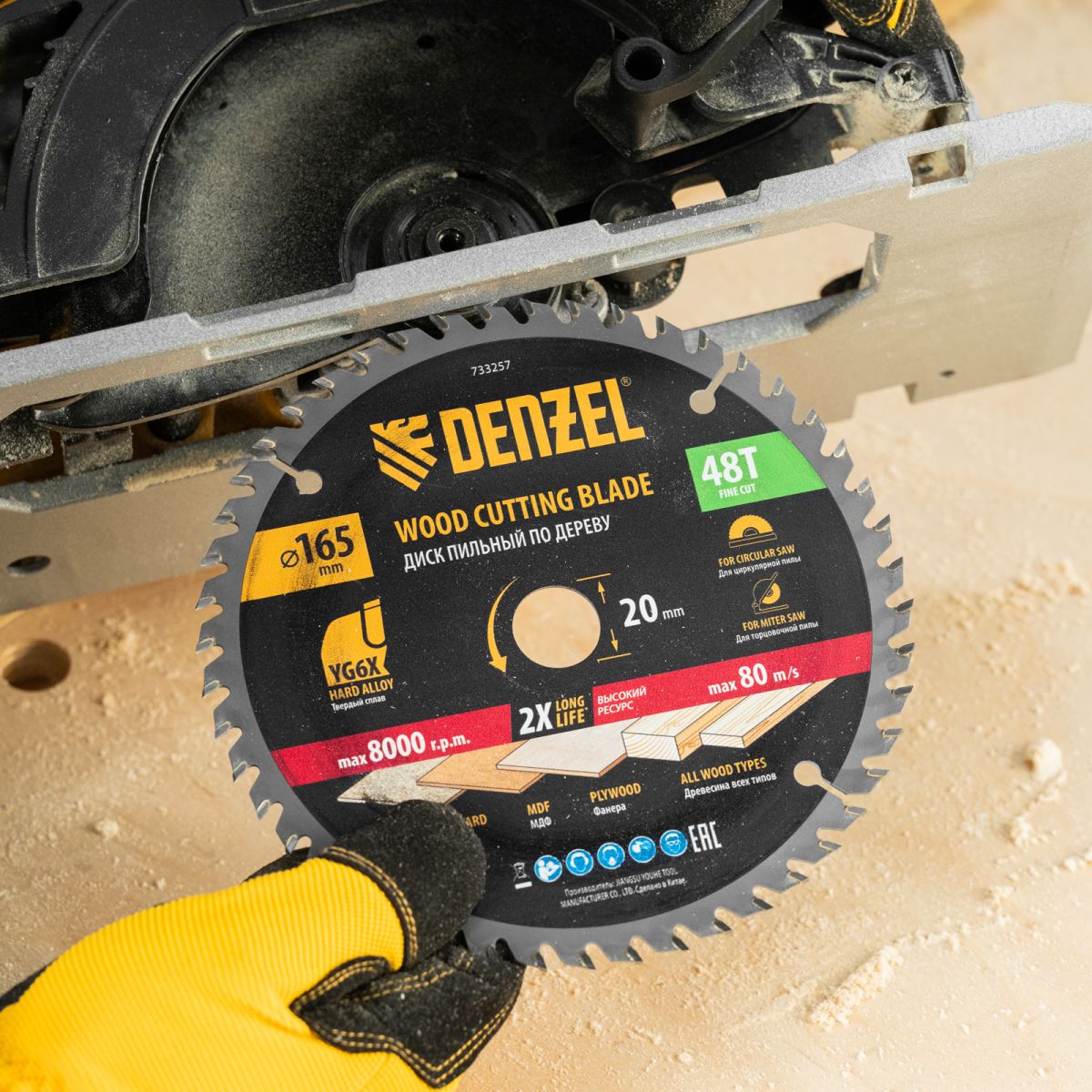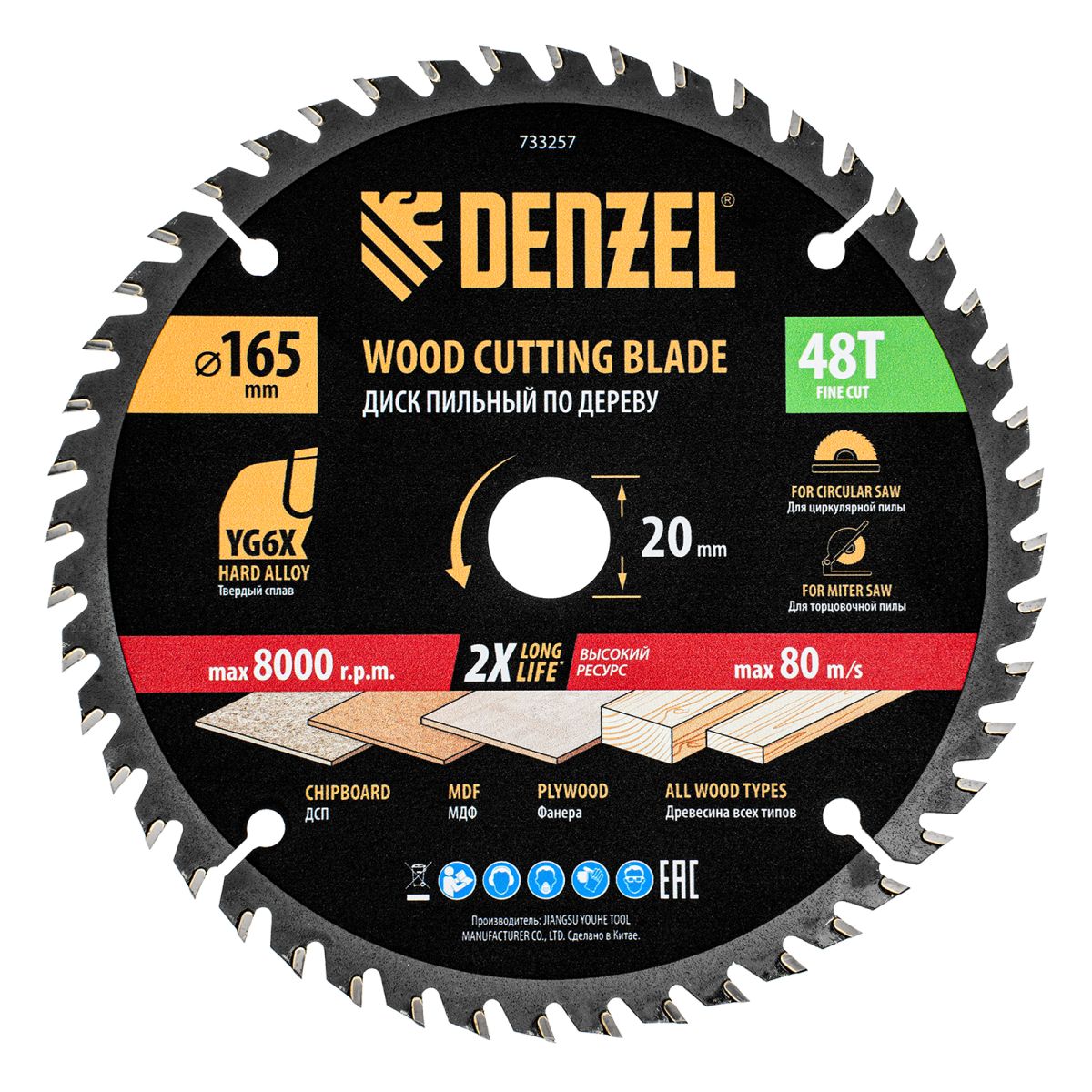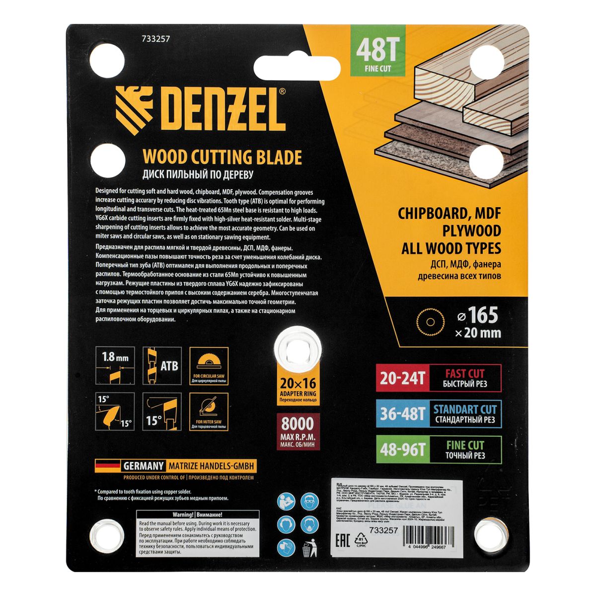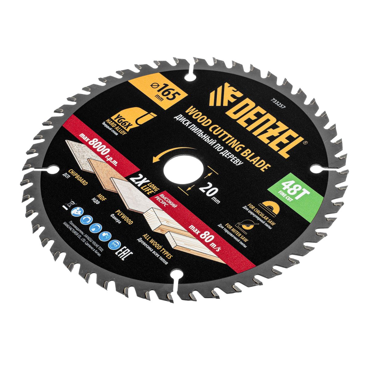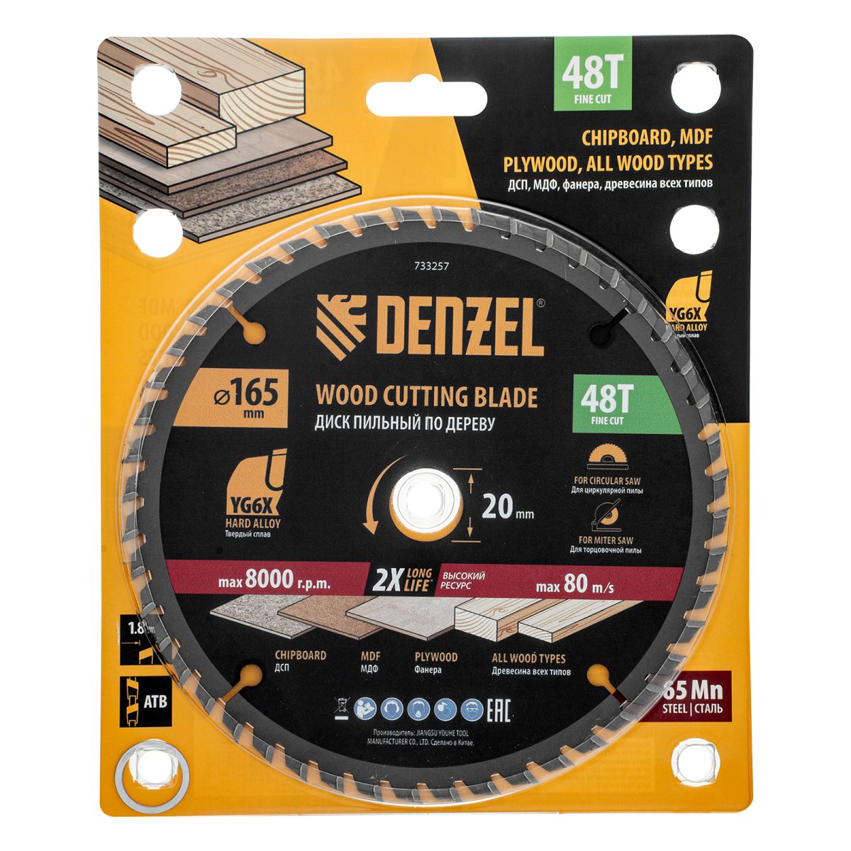 Пильный диск Denzel 733257 диаметром 165 x 20 мм, с 48 зубьями, предназначен для продольного и поперечного распила твердой и мягкой древесины, фанеры, МДФ, ДСП. 48 зубьев типа ATB с режущими пластинами оптимальной геометрии обеспечивают качественный рез. Тип реза — стандартный. Режущие пластины из твердого сплава YG6X сохраняют рабочие свойства при интенсивном использовании. Диск устанавливается на циркулярную, торцовочную пилу или на распиловочный станок. В комплект поставки входит переходное кольцо с 20 на 16 мм, что позволяет изменить посадочный размер и расширяет возможности использования диска.