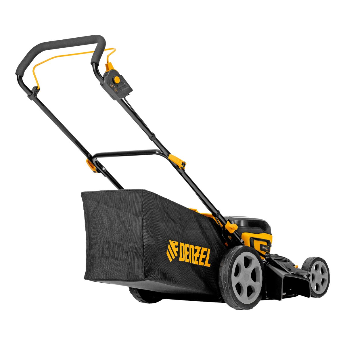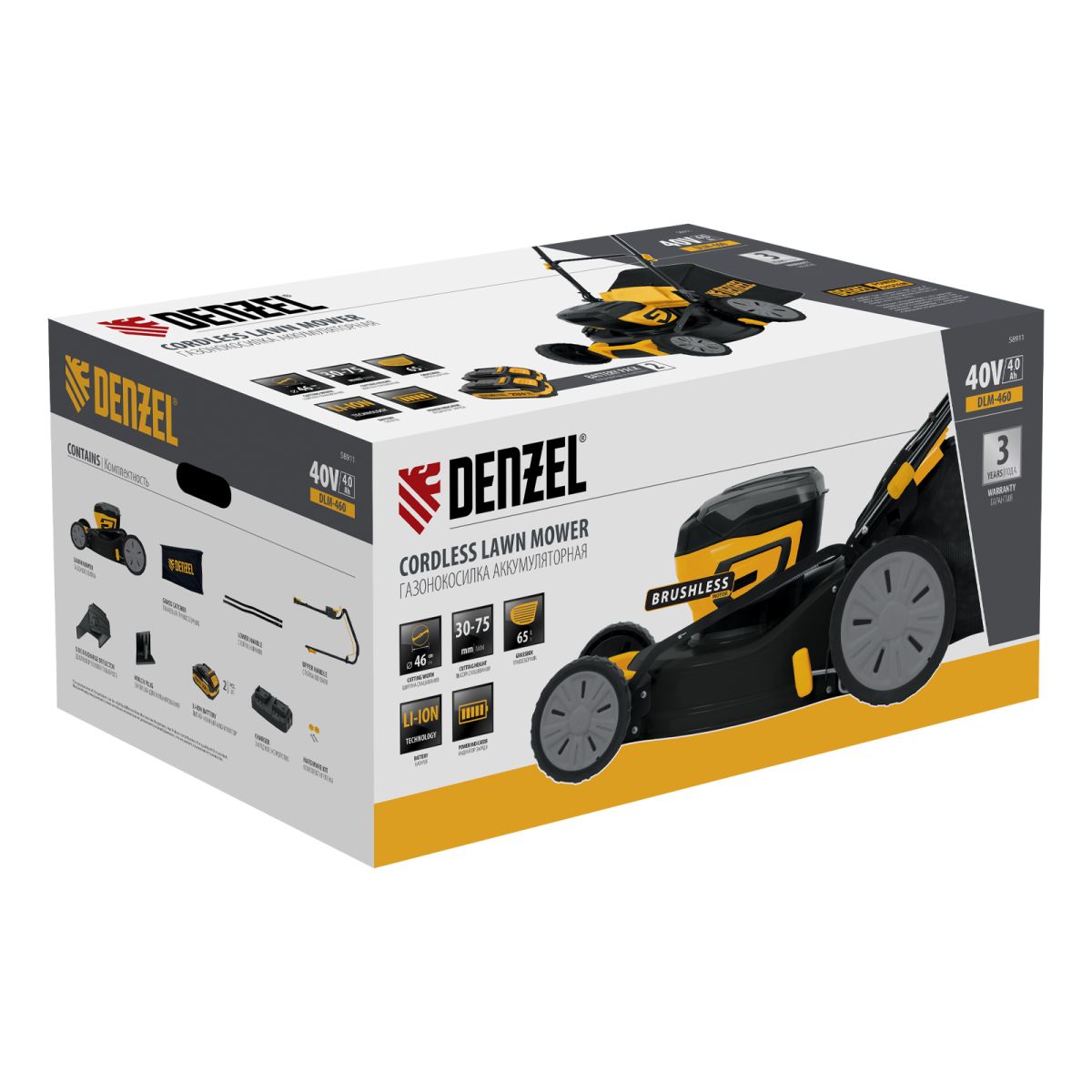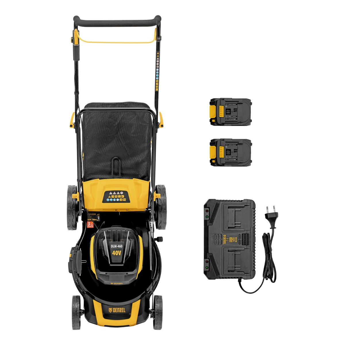 Газонокосилка в сборе с ножом и колесами - 1 штАккумуляторная батарея Denzel Power System - 2 штЗарядное устройство - 1 штТравосборник - 1 штВерхняя часть рукоятки - 2 штФиксаторы рукоятки - 2 штБолт для фиксатора рукоятки - 2 штШайба для фиксатора рукоятки - 2 штКлипса для провода - 2 штДефлектор бокового выброса - 1штЗаглушка для мульчирования - 1 штРуководство по эксплуатации c гарантийным талоном - 1 шт