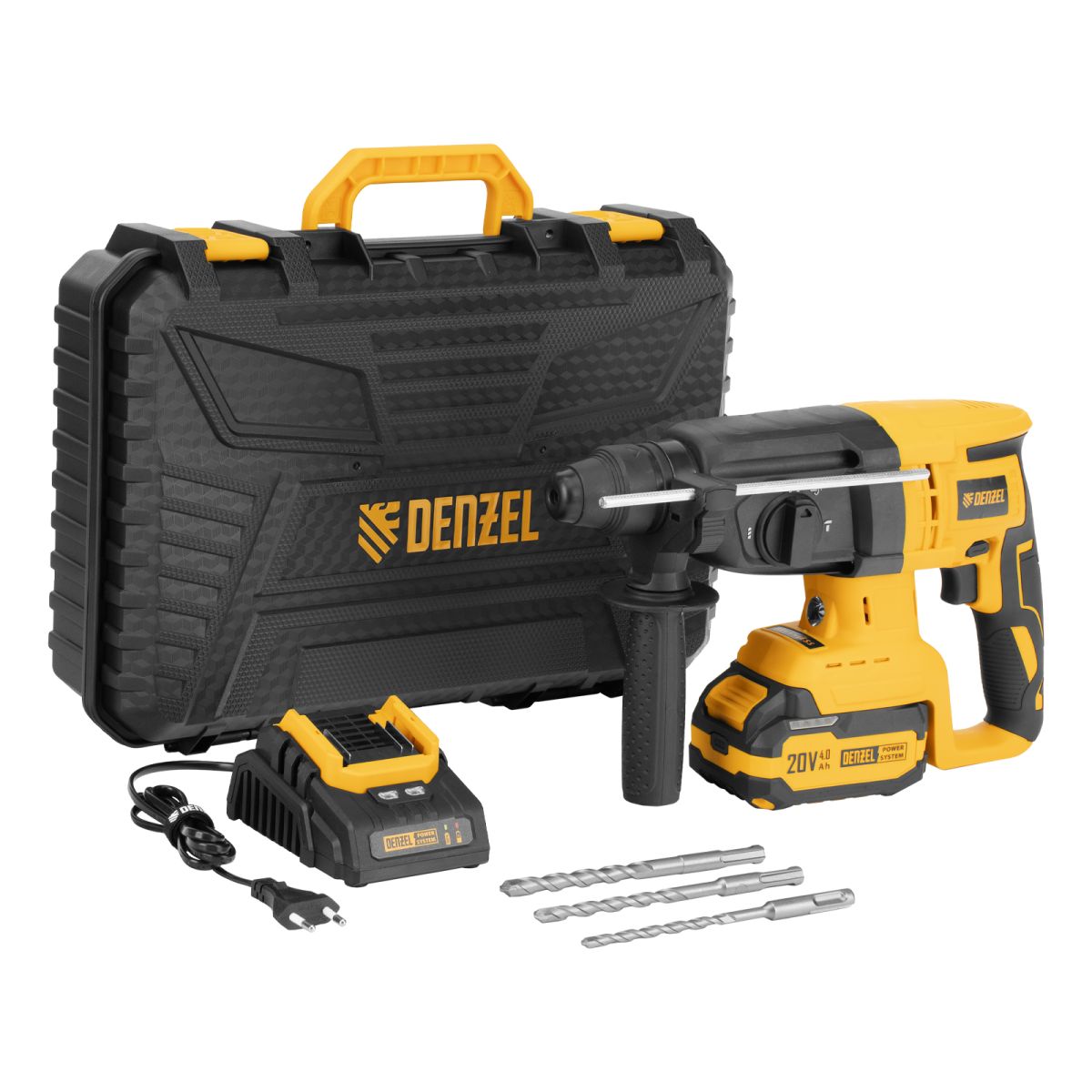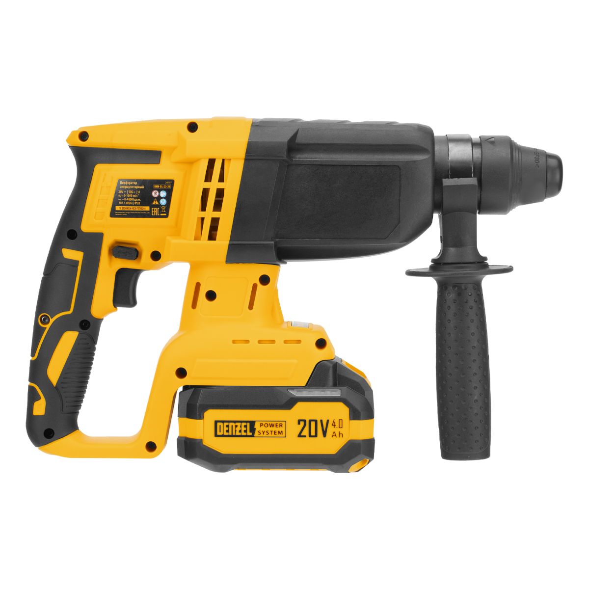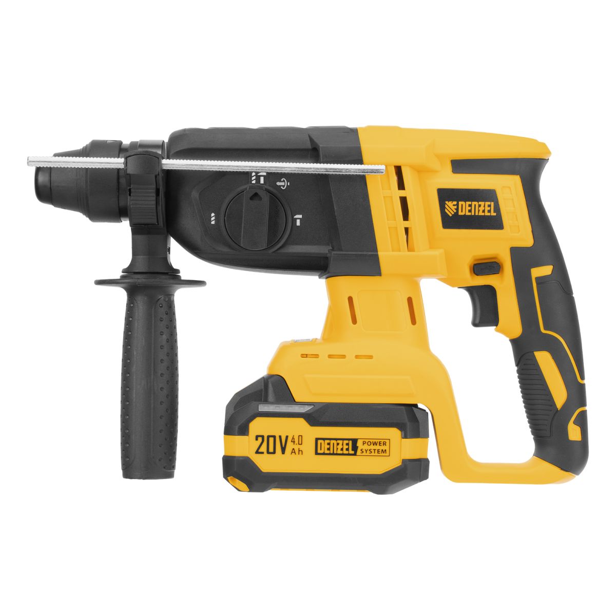 - Универсальность — аккумулятор Li-Ion емкостью 4 А·ч совместим со всеми инструментами единой платформы Denzel Power System 20V.
