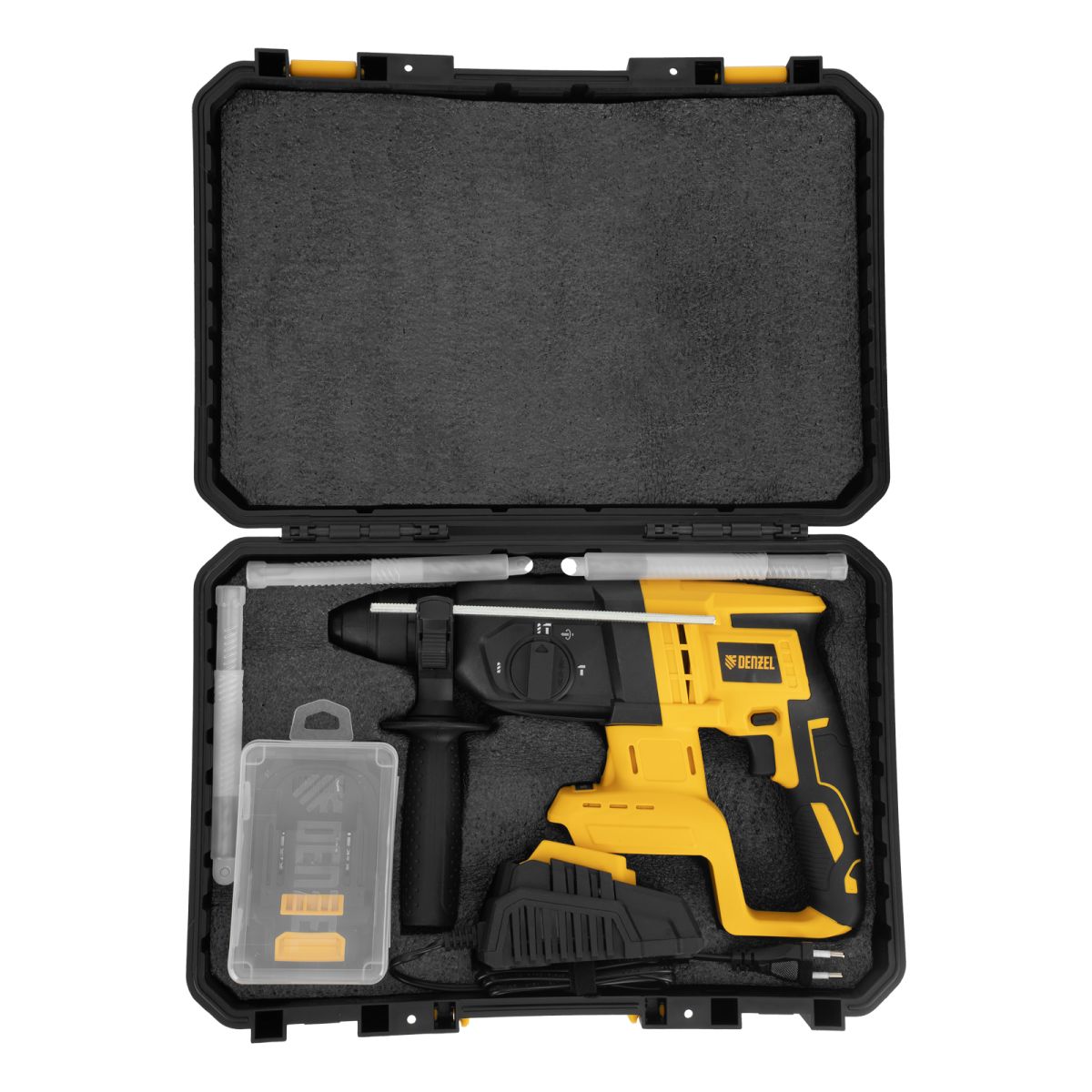 - Удобное хранение и транспортировка — перфоратор с аксессуарами поставляется в прочном кейсе.