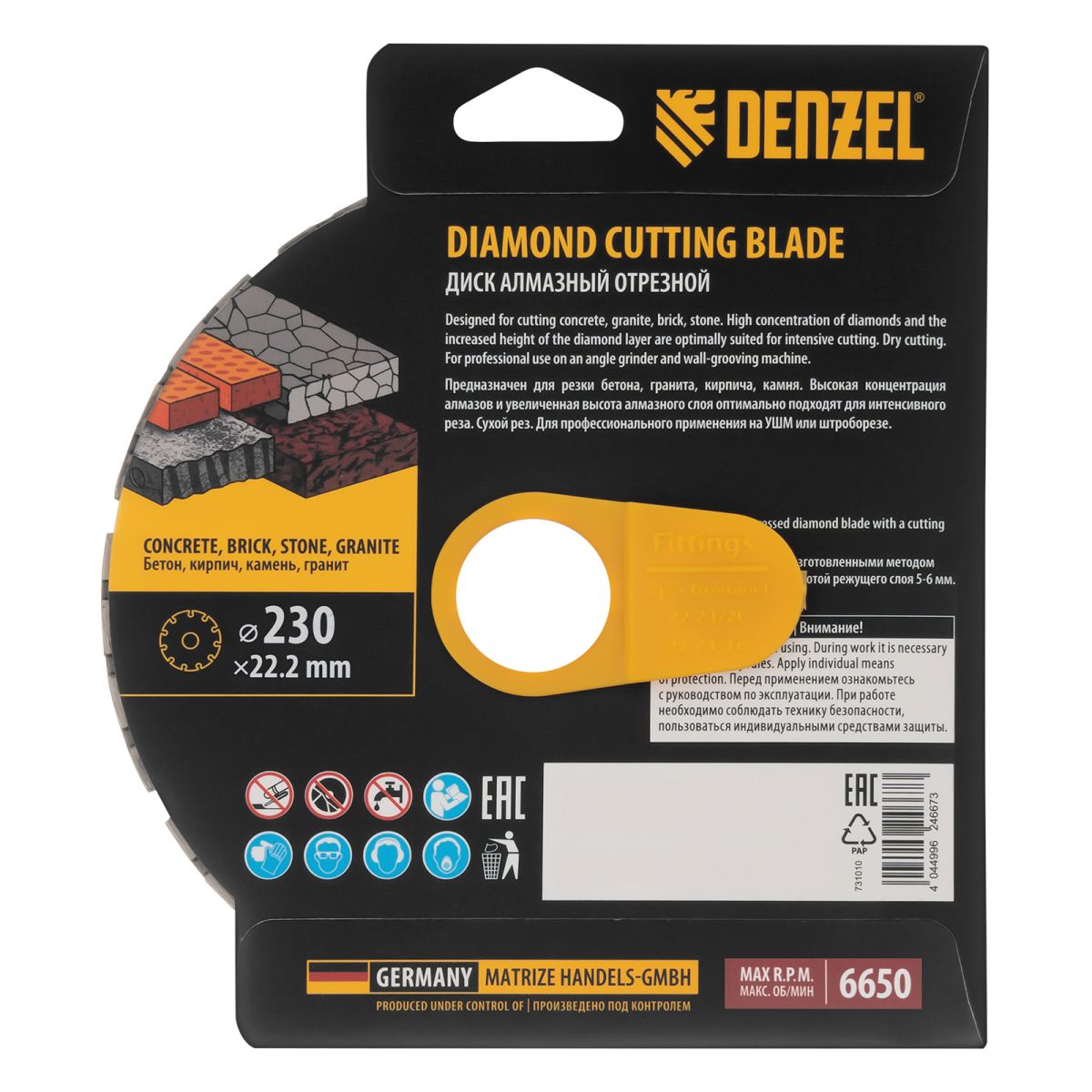 Алмазный отрезной диск Denzel 731040 диаметром 230 x 22,2 мм, с сегментной рабочей частью и слоем сверхтвердых алмазов HWD92, предназначен для сухого резания бетона, камня, кирпича, гранита. Используется с углошлифовальной машиной (УШМ) или штроборезом, поддерживающими частоту вращения 6650 об/мин.