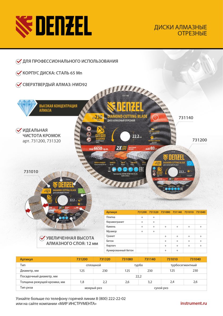 Алмазный отрезной диск Denzel 731200 диаметром 125 x 22,2 мм, со сплошной рабочей частью и слоем сверхтвердых алмазов HWD92, предназначен для мокрого резания твердых материалов. Оптимален для работы с керамогранитом, керамической плиткой, мрамором, камнем. Устанавливается на УШМ, поддерживающую частоту вращения 12250 об/мин. Необходимо использование водяного охлаждения для наиболее эффективной работы и увеличения ресурса оснастки.