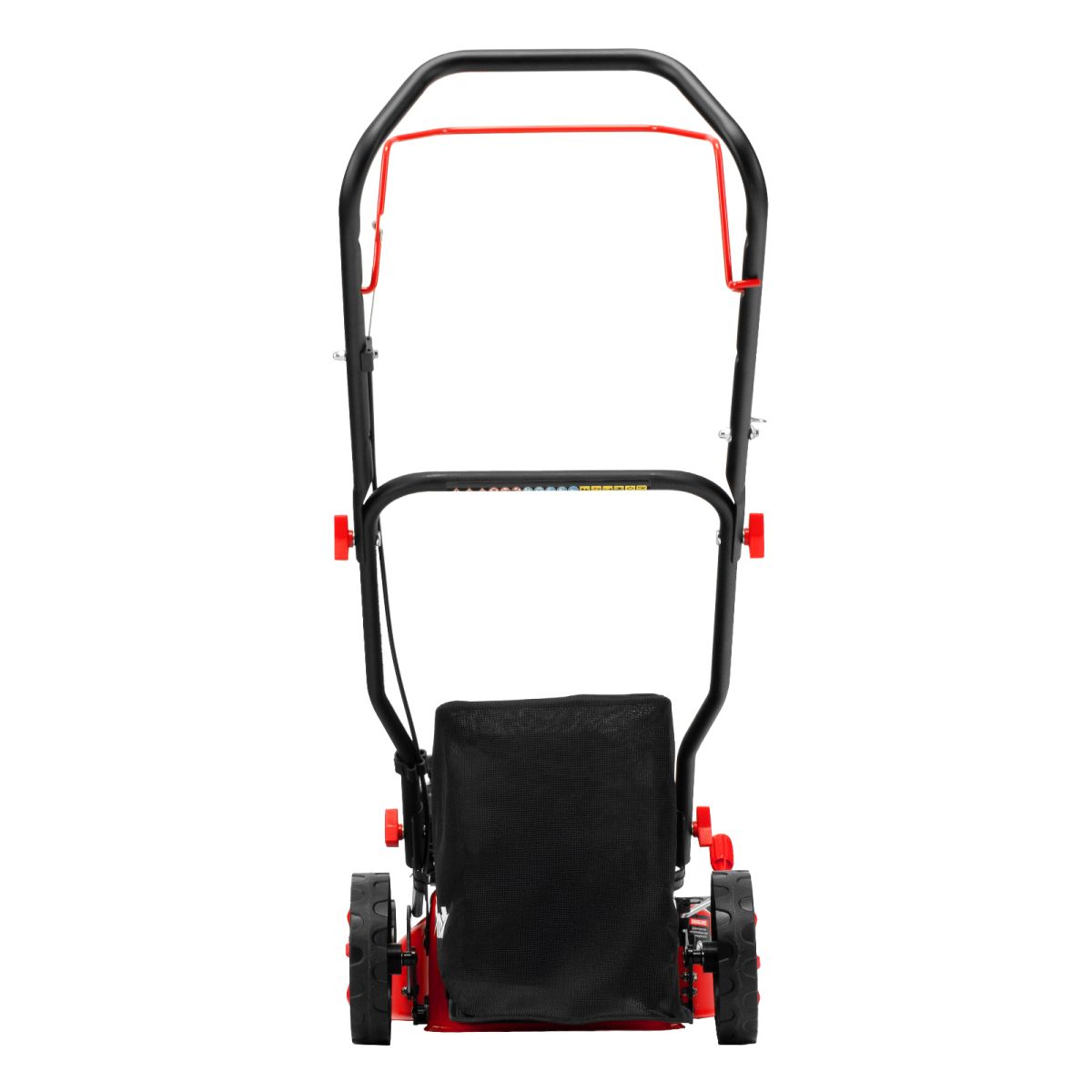 - Удобная эксплуатация и хранение — усиленная конструкция рукоятки позволяет комфортно управлять газонокосилкой, тканевый травосборник не утяжеляет конструкцию, а в сложенном состоянии не занимает много места.