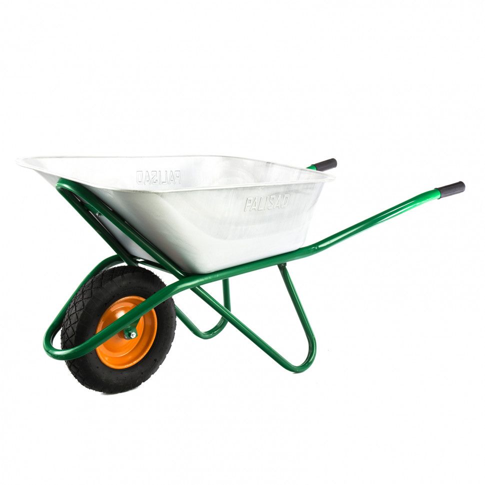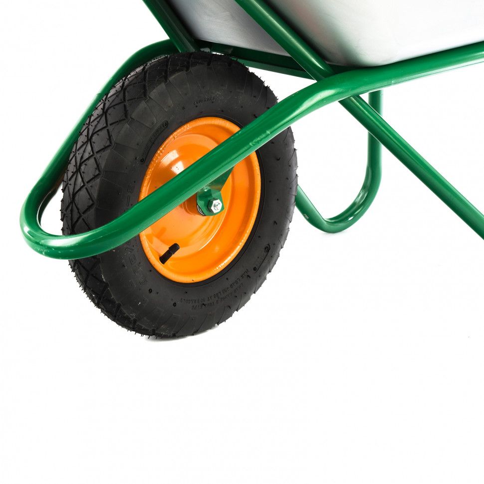 - Маневренность — пневматическое колесо с камерой и 2 шариковыми подшипниками облегчает перемещение нагруженной тачки.