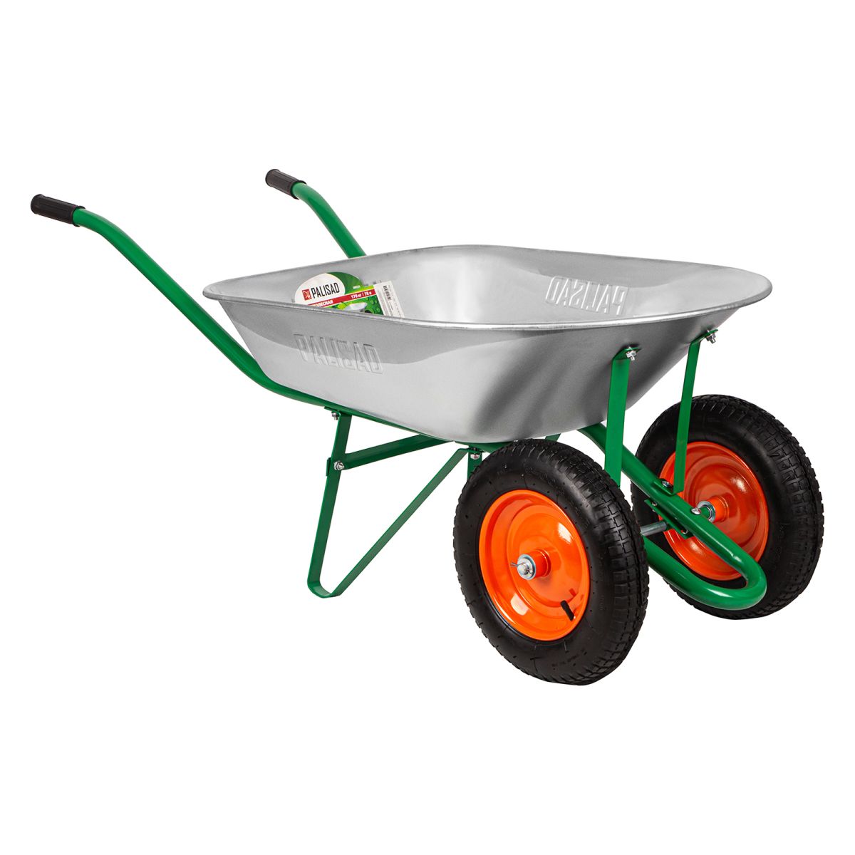 Садовая тачка Palisad 689225 с двумя колесами, грузоподъемностью 170 кг и с кузовом объемом 78 л, рассчитана на транспортировку садовых и легких строительных грузов. Избавляет от необходимости ручного перемещения тяжестей и позволяет снизить нагрузку на спину.
