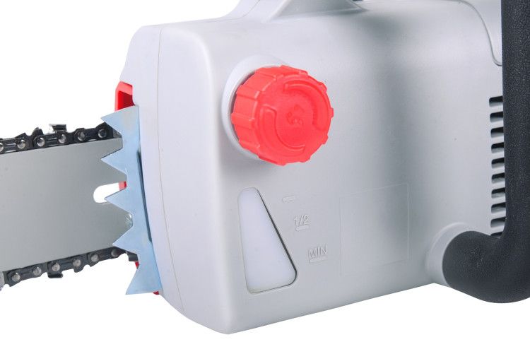- Надежное удержание. Удобная задняя рукоятка небольшого размера с пусковым курком жестко сидит в руке, что способствует надежному удержанию электропилы.