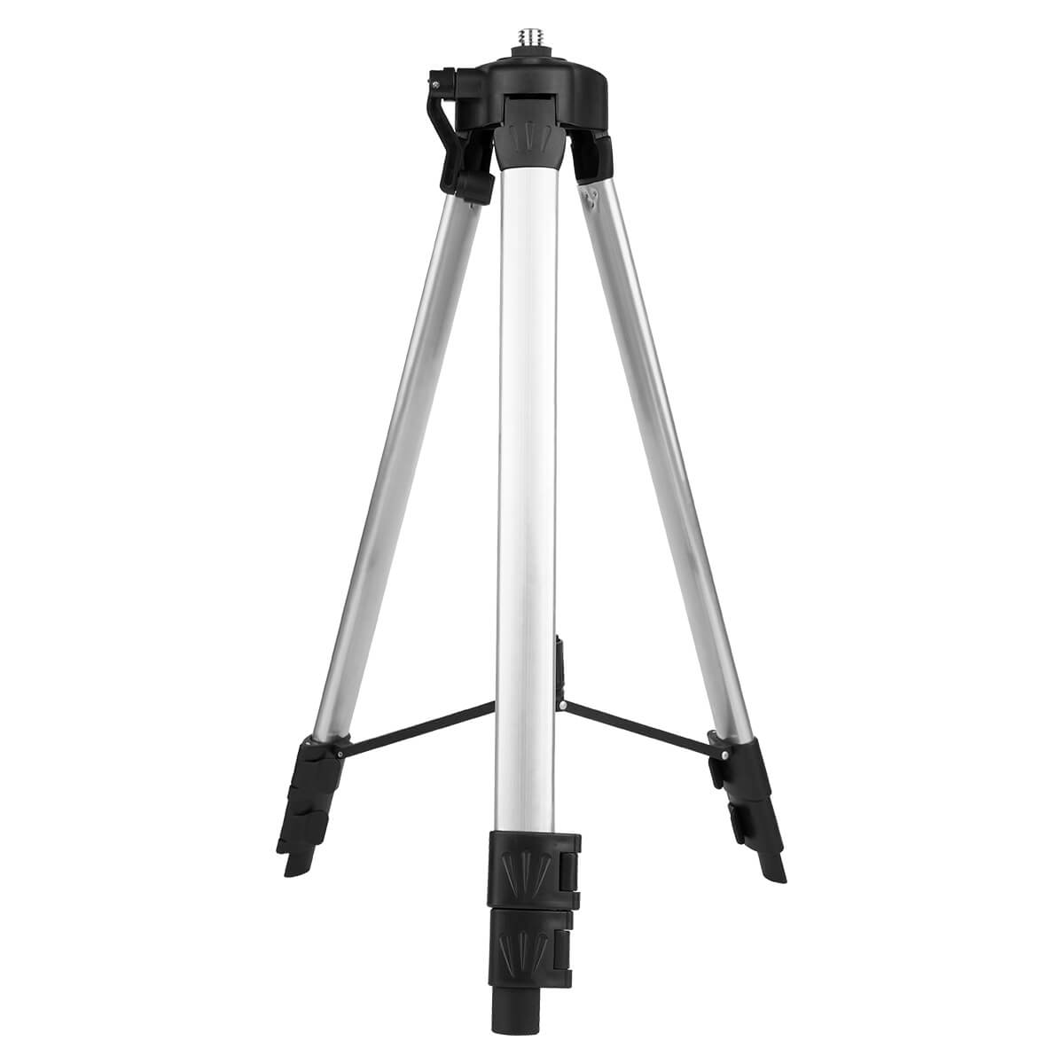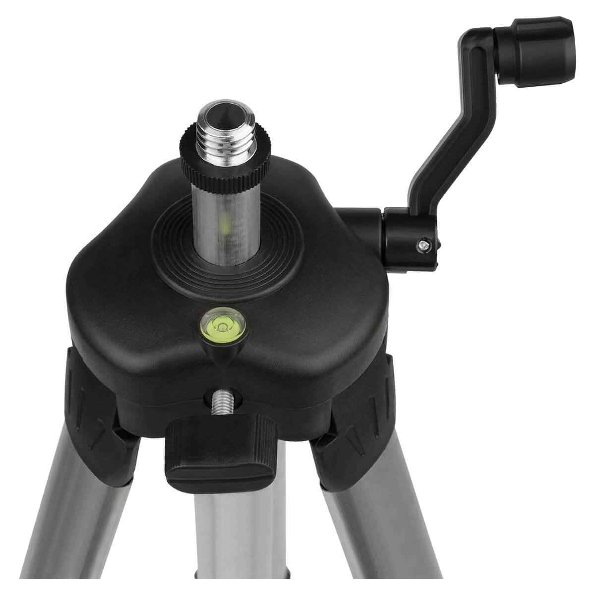 Телескопические стойки штатива для лазерных уровней AMO A150 прочно фиксируются клипсами. Такой метод крепления значительно ускоряет подготовку к работе, позволяя за секунды разобрать и установить треногу на точке. Встроенный пузырьковый уровень используется в качестве ориентира при выравнивании оборудования.