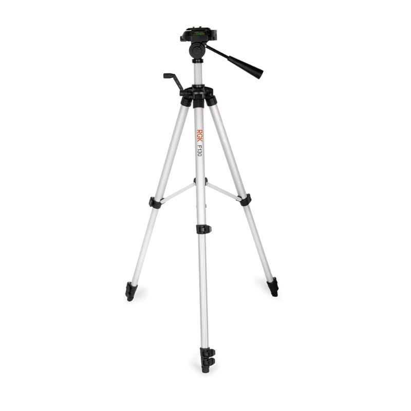 Отдельная рукоятка элевационного штатива RGK F130 позволяет наклонять нивелир или дальномер под углом для проведения таких работ, как отделка лестничных маршей или установка перил. При работе с лазерным дальномером наклонная головка значительно облегчает наведение на точку и обеспечивает стабильность измерений. За корректность позиционирования отвечает встроенный в площадку пузырьковый уровень.