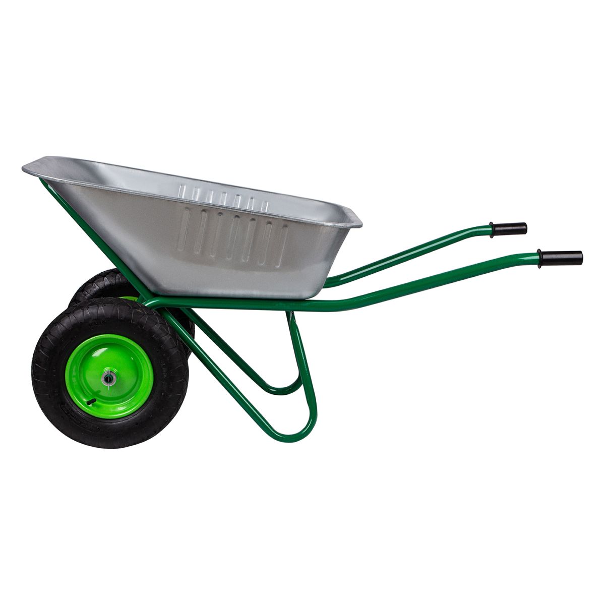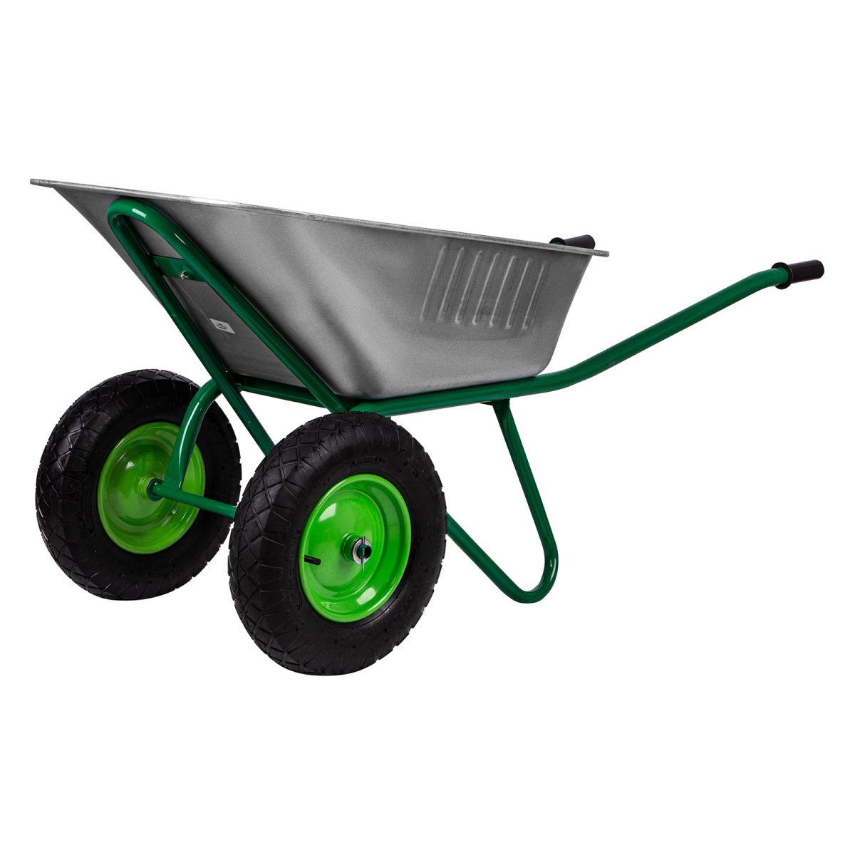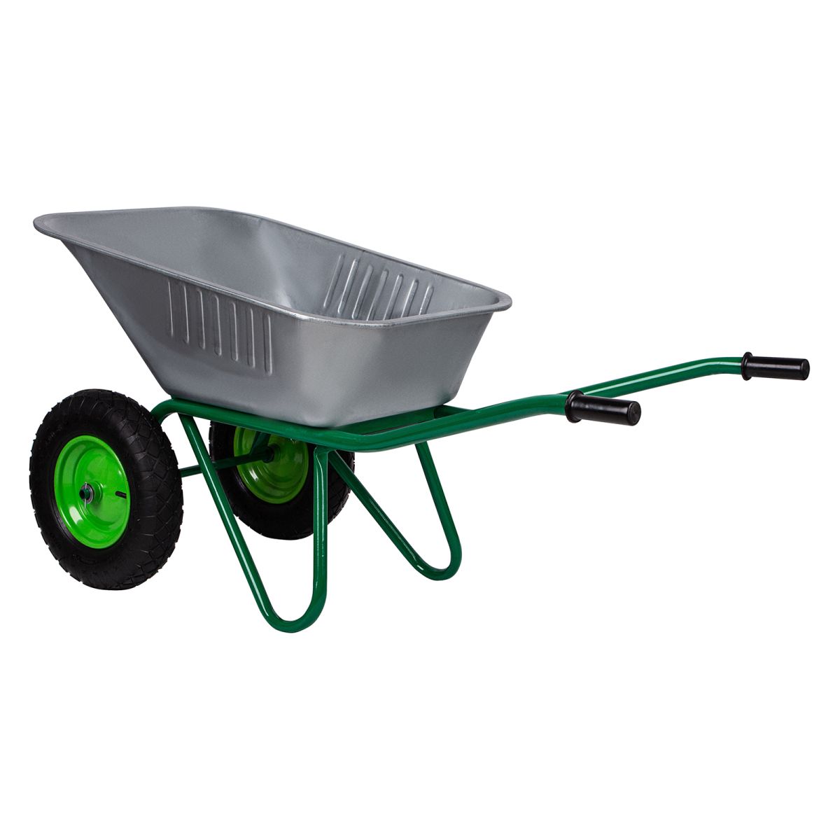 Усиленная садово-строительная тачка 689863, 2-колесная, грузоподъемностью 320 кг и объемом корыта 100 л, будет полезна во время строительства или ухода за дачным участком. Ее используют для перемещения мусора, веток, листьев, грунта, щебня, песка, а также строительных смесей. Необходимая грузоподъемность достигается благодаря стальной раме с толщиной стенок 1,2 мм и кузову со стенками толщиной 0,7 мм. 2 колеса увеличивают устойчивость тачки. Шарикоподшипники облегчают вращение колес, поэтому тачку легко перемещать по неровной поверхности.