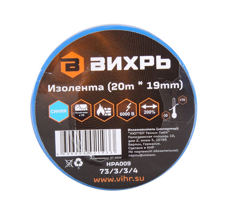 Изолента Вихрь ПВХ синяя (20 м * 19 мм)