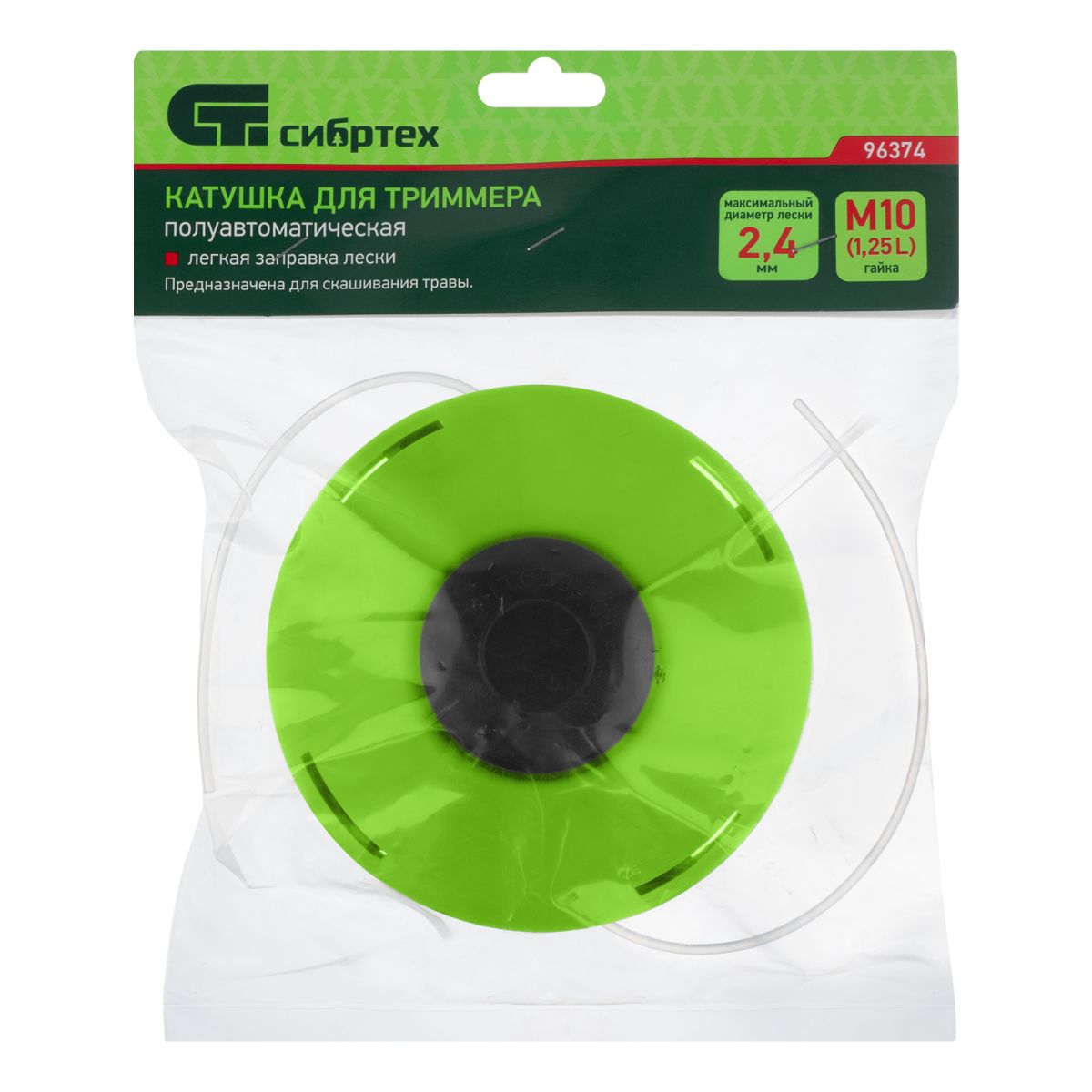 Облегченная полуавтоматическая катушка Сибртех 96372 устанавливается на бензиновый или электрический триммер при помощи гайки М10 х 1,25 с левой резьбой. Заправляется леской диаметром до 2,4 мм. Катушка используется для скашивания газонной и сорной травы, будет полезна владельцам дачных участков.
