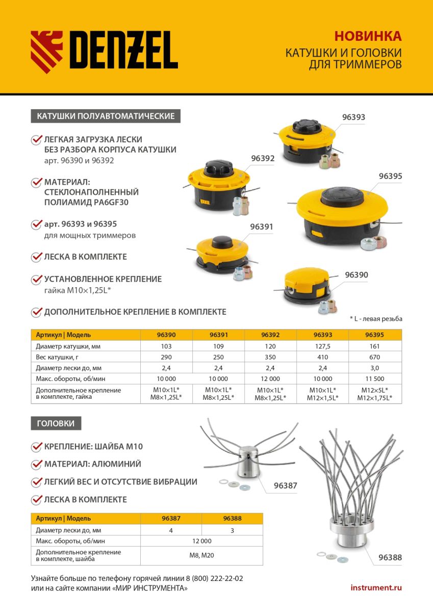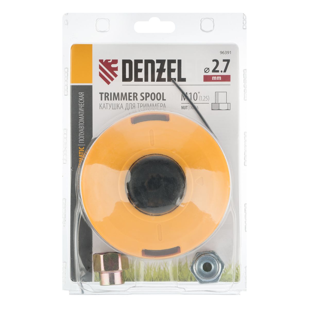 Полуавтоматическая триммерная катушка Denzel 96391 имеет посадочный размер M10 с левой резьбой 1,25 мм, а также комплектуется гайками М10 х 1 мм (правая резьба) и М8 х 1,25 мм (левая резьба). Устанавливается на вал электрического или бензинового триммера и используется для ухода за озелененной территорией. В катушку можно заправлять леску диаметром до 2,7 мм, что позволяет как подравнивать молодую газонную траву, так и скашивать сорняки.
