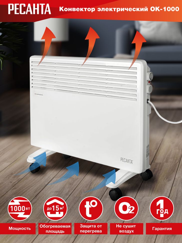Электрический конвектор РЕСАНТА ОК-1000 для обогрева помещений. Состоит из нагревательной части (ТЭН), заключенной в нижней части корпуса со щелеобразными отверстиями снизу и жалюзи в верхней части. Данная конструкция даёт возможность воздуху беспрепятственно проходить внутри конвектора,