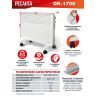 онвектор РЕСАНТА ОК-1700 для обогрева помещений. Состоит из нагревательной части (ТЭН), заключенной в нижней части корпуса со щелеобразными отверстиями снизу и жалюзи в верхней части. Данная конструкция даёт возможность воздуху беспрепятственно проходить внутри конвектора,