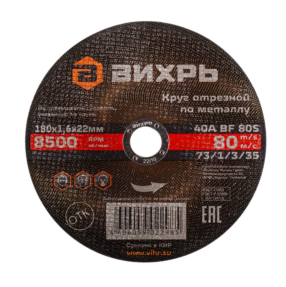 Круг отрезной по металлу Вихрь 180х1,6х22 мм