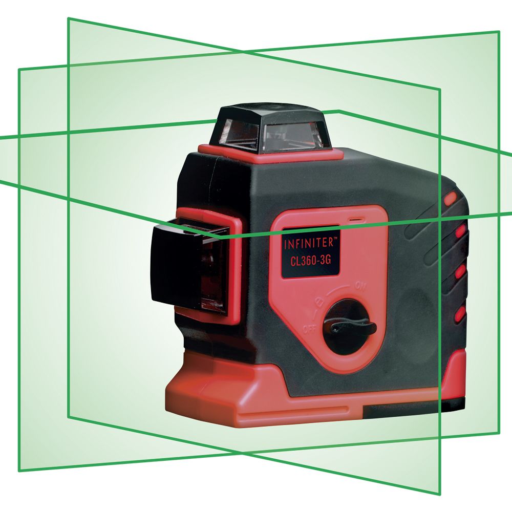 Лазерный нивелир INFINITER CL360-3G проецирует одну горизонтальную плоскость 360° и две ортогональные вертикальные плоскости 360°. Диапазон работы лазера достигает 50 м (с детектором), а погрешность всего 0,3 мм/м. Точки отвеса (зенит, надир) образуются пересечением вертикальных плоскостей.