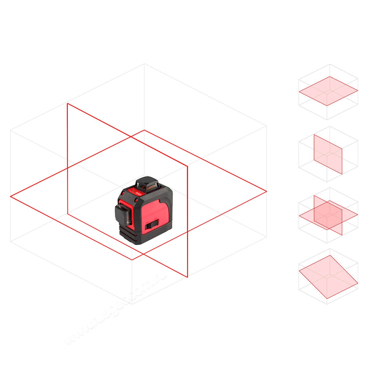 Лазерный уровень RGK PR-2M может проецировать по отдельности вертикальную или горизонтальную плоскость, или одновременно обе. Это поможет сэкономить заряд батарей и устранить лишние световые помехи, отключив ненужную лазерную линию.