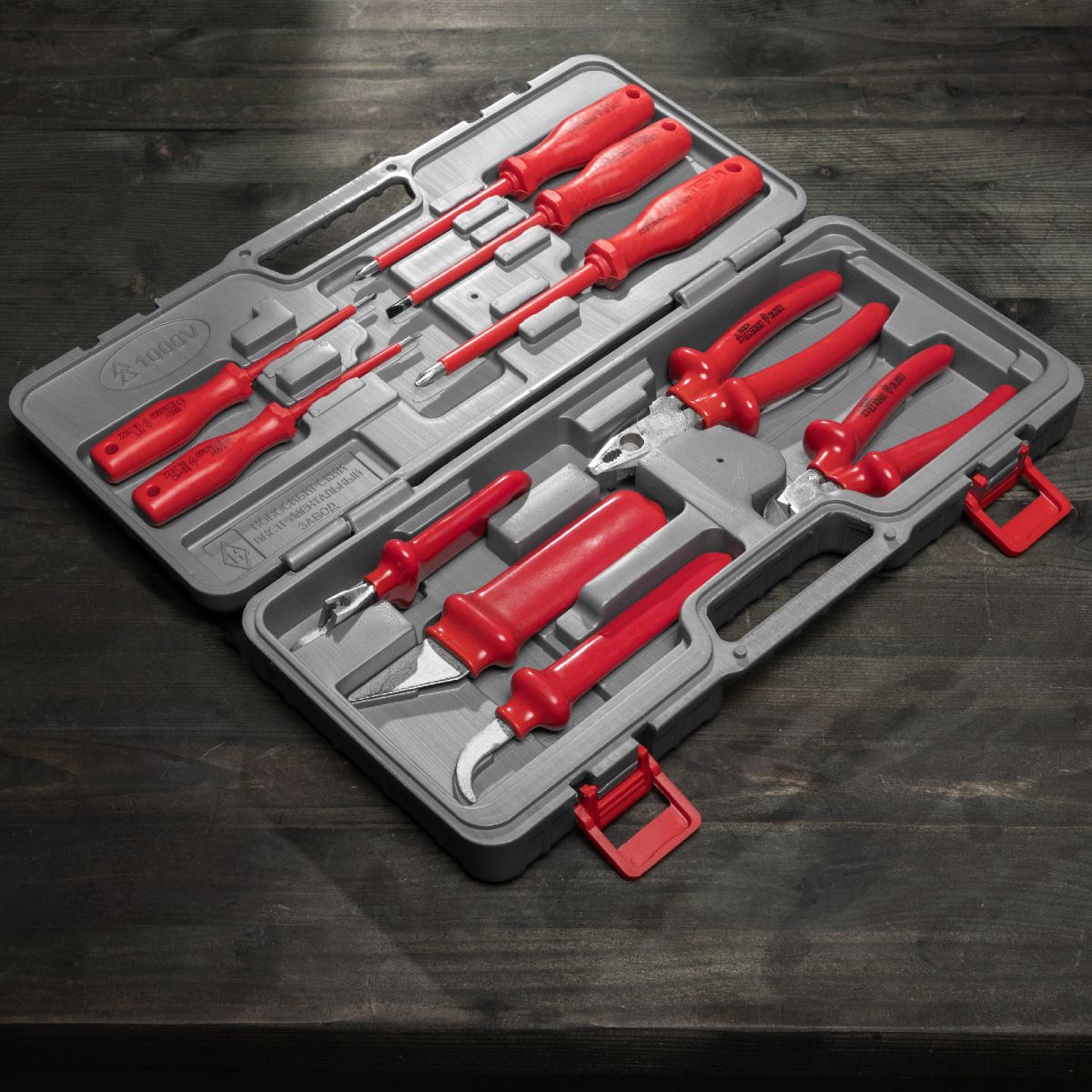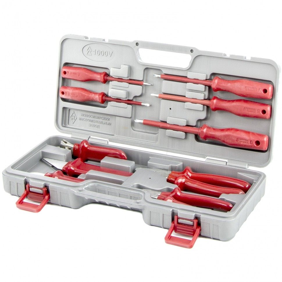 Отвертки плоские - 2 штОтвертки крестообразные - 3 штКлюч разводной - 1 штНож кабельный - 1 штНож прямой - 1 штПлоскогубцы - 1 штБокорезы - 1 штКейс - 1 шт