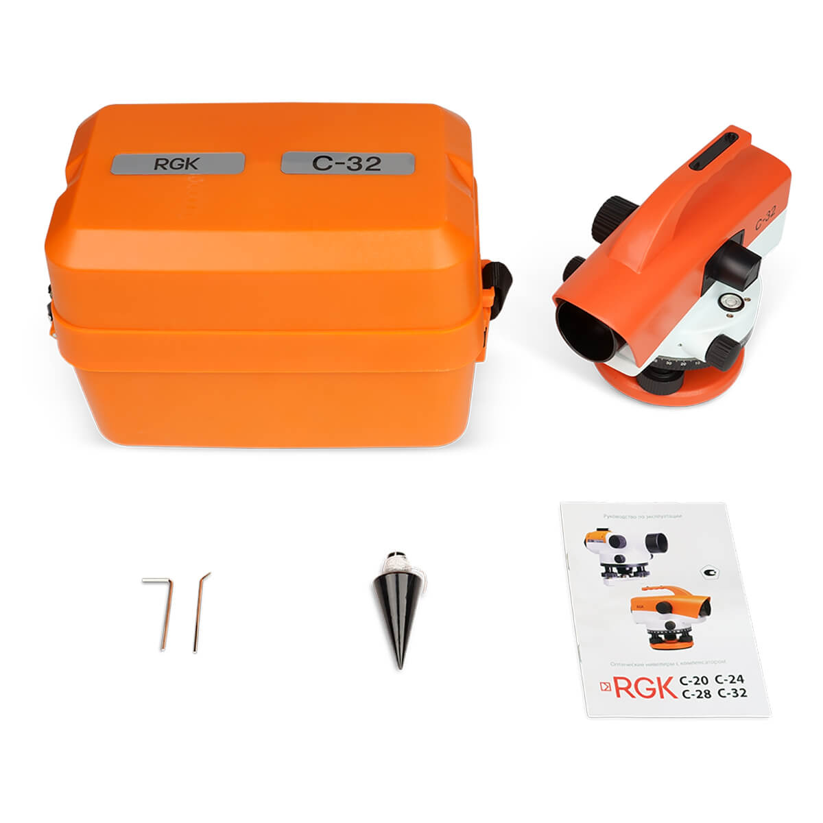 Стандартная комплектация: оптический нивелир RGK C-32, нитяной отвес, юстировочный набор, руководство по эксплуатации, транспортировочный кейс.