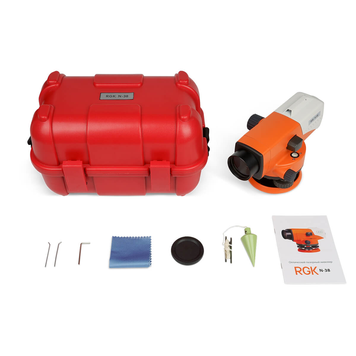 Стандартная комплектация: оптический нивелир RGK N-38, нитяной отвес, юстировочный набор (шестигранный ключ, шпилька), транспортный кейс.