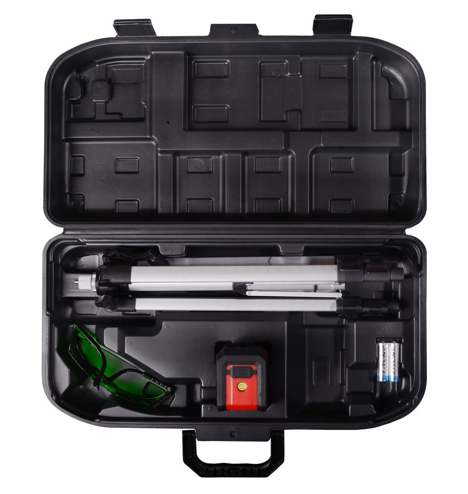 Лучи: 1V, 1H, точность: ±1 мм / 5 м, 1/4”, самовыравнивание ±4°, питание от 2×АА, штатив, кейс, очки