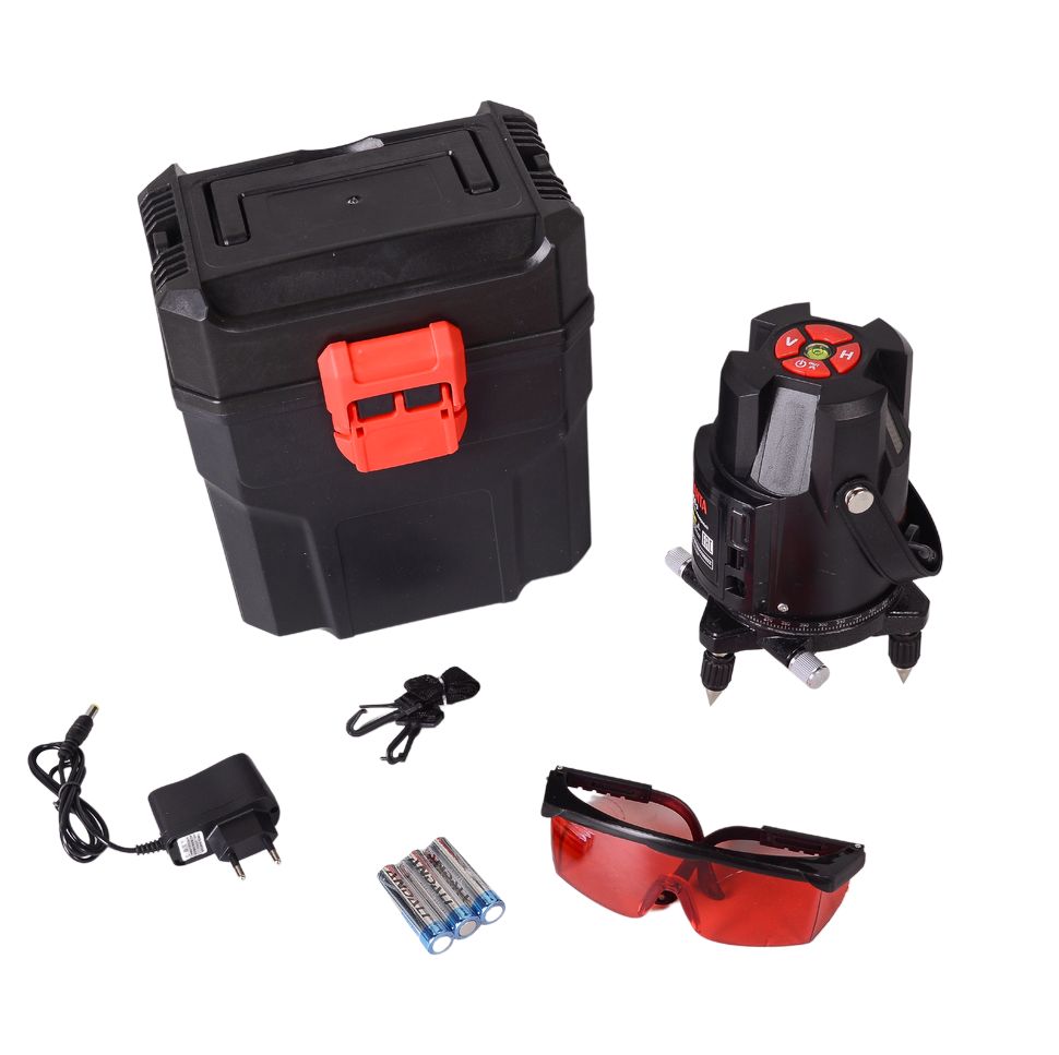 Лучи: 2V, 1H, 1D, точность: ±1 мм / 5 м, 5/8”, самовыравнивание ±4°, питание от 3×АА, кейс, очки