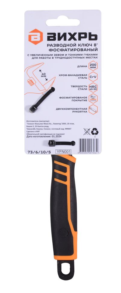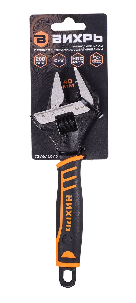 Разводной ключ с тонкими губками, фосфатированный, 200 мм, Вихрь