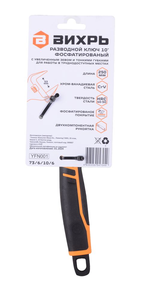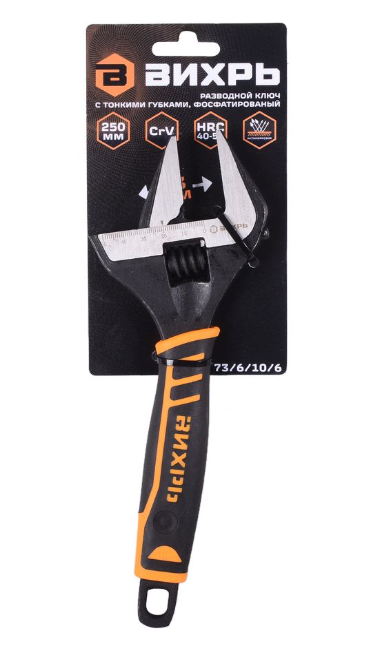 Разводной ключ с тонкими губками, фосфатированный, 250 мм, Вихрь